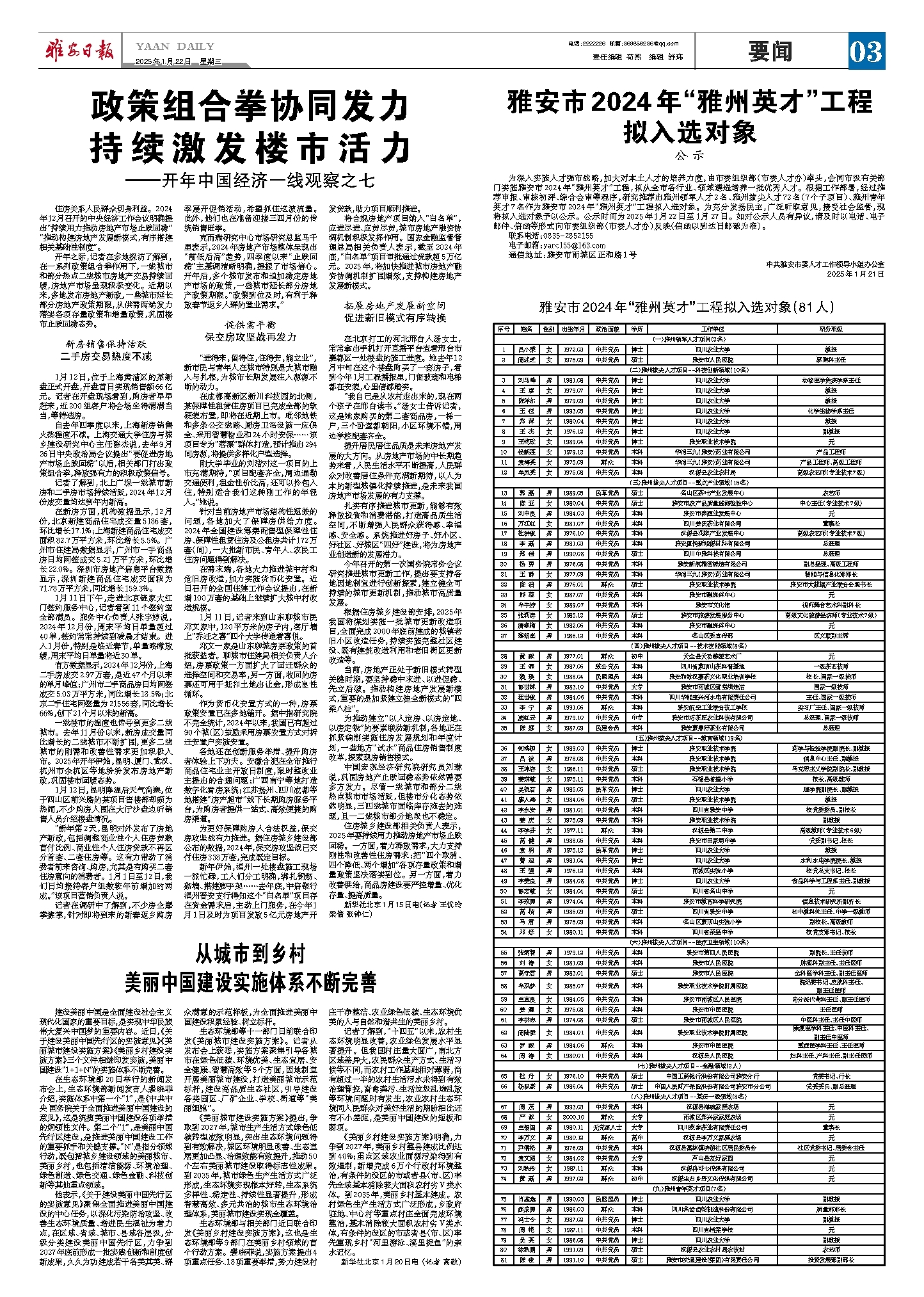 为深入实施人才强市战略,加大对本土人才的培养力度,由市委组织部(市委人才办)牵头,会同市级有关部门实施雅安市2024年“雅州英才”工程,拟从全市各行业、领域遴选培养一批优秀人才。根据工作部署,经过推荐申报、审核初评、综合会审等程序,研究推荐出雅州领军人才2名、雅州拔尖人才72名(7个子项目)、雅州青年英才7名作为雅安市2024年“雅州英才”工程拟入选对象。为充分发扬民主,广泛听取意见,接受社会监督,现将拟入选对象予以公示。公示时间为2025年1月22日至1月27日。如对公示人员有异议,请及时以电话、电子邮件、信函等形式向市委组织部(市委人才办)反映(信函以到达日邮戳为准)。