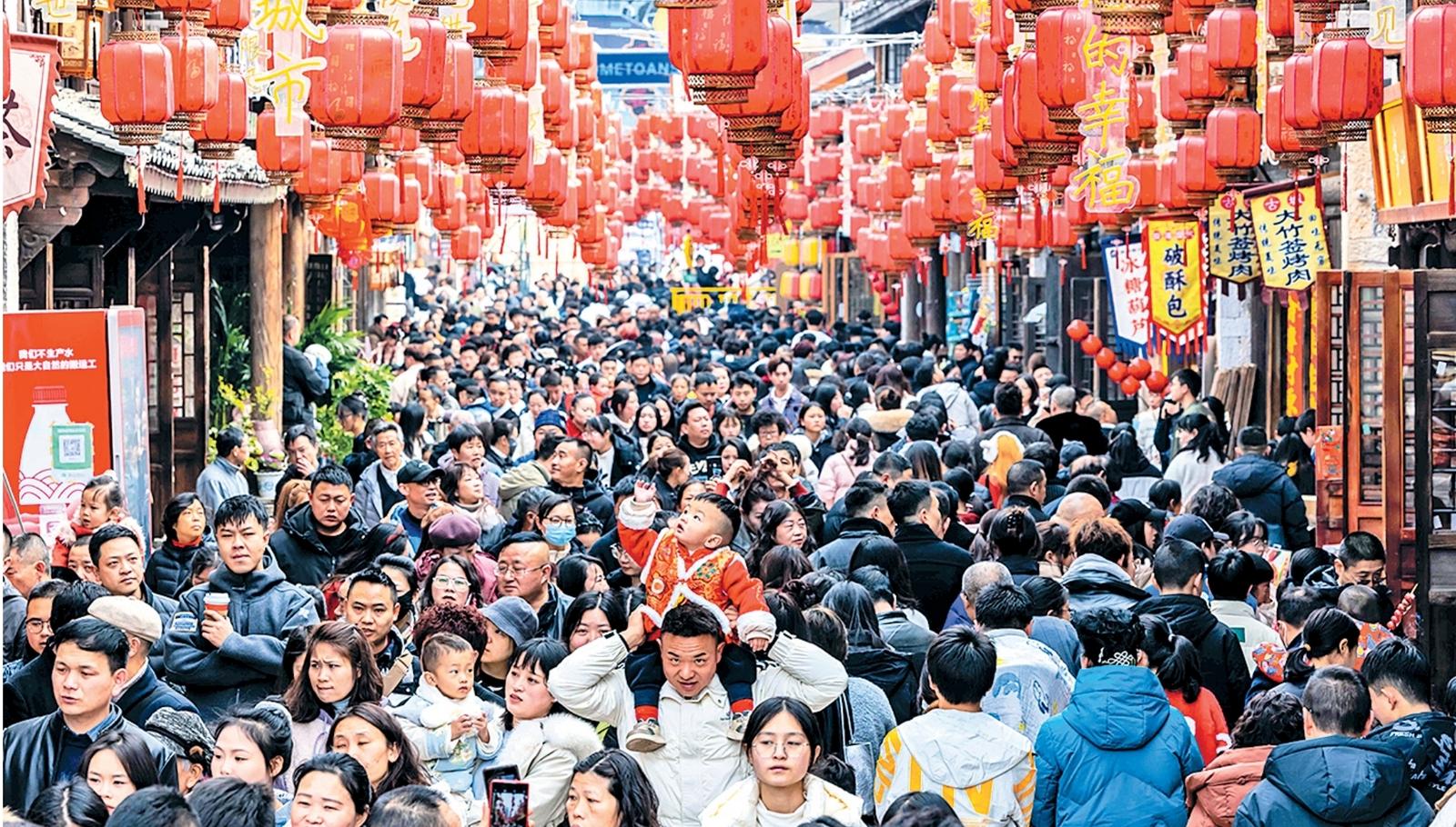 1月29日,游客在贵州省安顺市西秀区安顺古城历史文化街区游玩 陈熙 摄