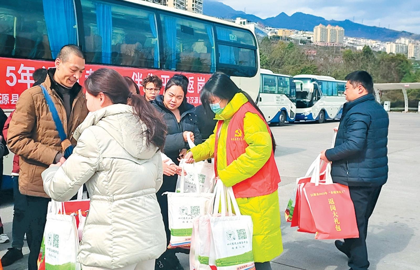 刚上车,外出务工人员、汉源县富泉镇村民张小明与同伴就收到了装有口罩、牛奶、面包、政策宣传资料等物品的“暖心返岗大礼包”。“我在外打工好几年了,现在有专车直接把我们送到务工地,真是太好了。”张小明说,以前出去务工都是自己买票乘车,有的时候还得换乘几次交通工具,拿着行李很不方便,现在乘坐县里组织的返岗服务专车,不仅减少了返岗乘车的中转环节,还降低了在旅途中的风险。