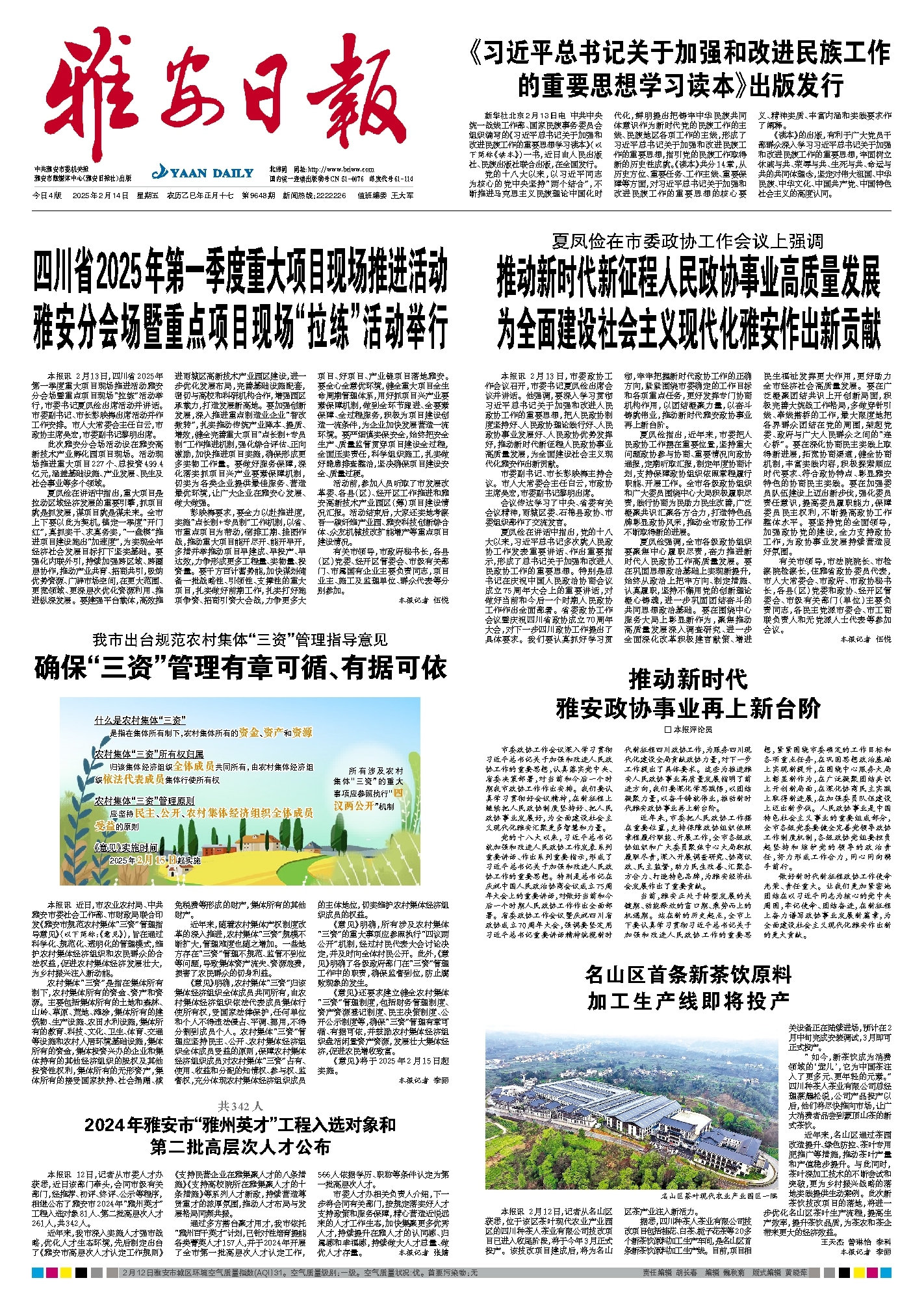 本报讯 近日,市农业农村局、中共雅安市委社会工作部、市财政局联合印发《雅安市规范农村集体“三资”管理指导意见》(以下简称:《意见》),旨在通过科学化、规范化、透明化的管理模式,维护农村集体经济组织和农民群众的合法权益,促进农村集体经济发展壮大,为乡村振兴注入新动能。