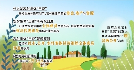 《意见》明确,农村集体“三资”归该集体经济组织全体成员共同所有,由农村集体经济组织依法代表成员集体行使所有权,受国家法律保护,任何单位和个人不得违法侵占、平调、挪用,不得分割到成员个人。农村集体“三资”管理应坚持民主、公开、农村集体经济组织全体成员受益的原则,保障农村集体经济组织成员对农村集体“三资”占有、使用、收益和分配的知情权、参与权、监督权,充分体现农村集体经济组织成员的主体地位,切实维护农村集体经济组织成员的权益。
