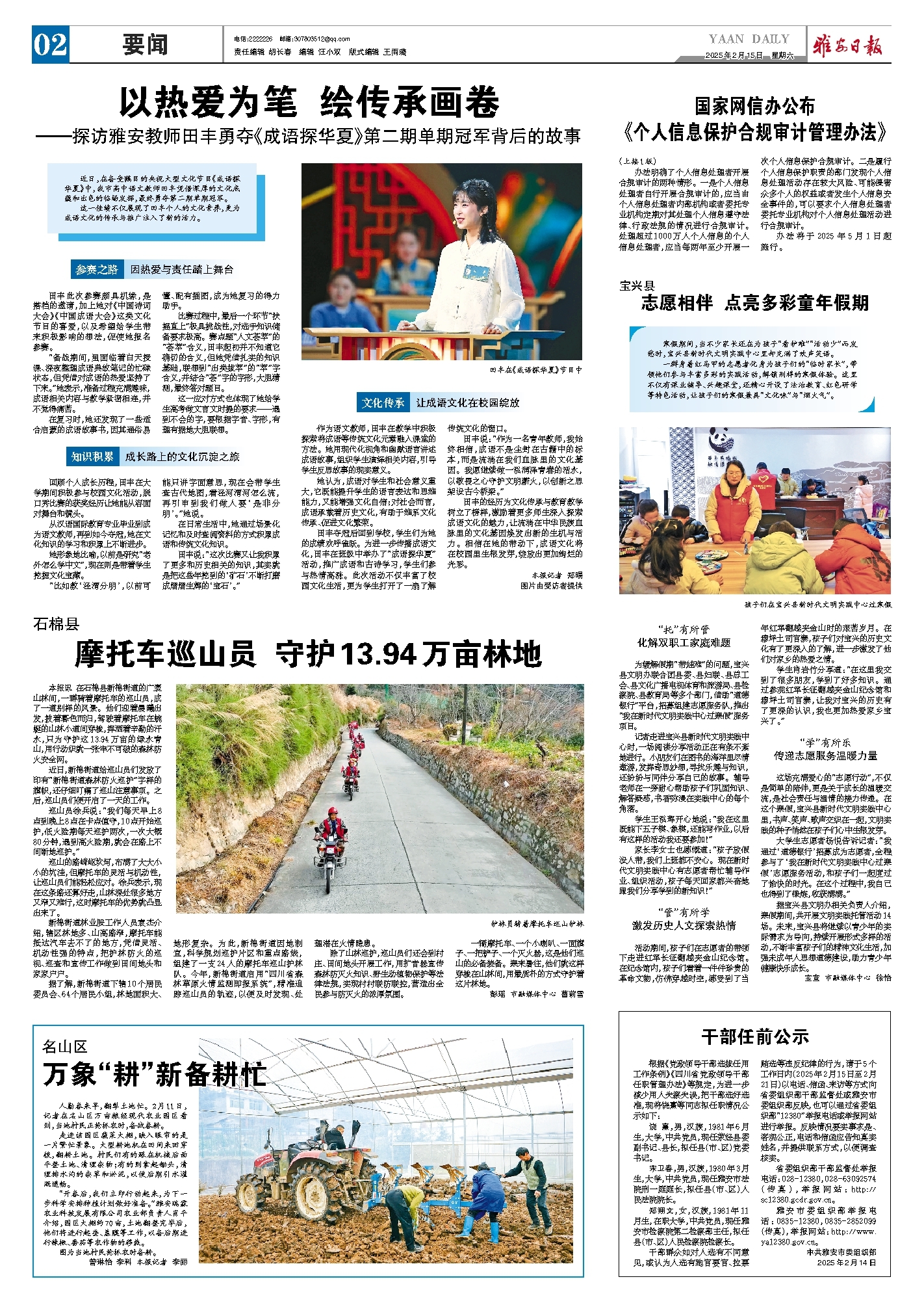 本报讯 在石棉县新棉街道的广袤山林间,一群骑着摩托车的巡山员,成了一道别样的风景。他们迎着晨曦出发,披着暮色而归,驾驶着摩托车在蜿蜒的山林小道间穿梭,挥洒着辛勤的汗水,只为守护这13.94万亩的绿水青山,用行动织就一张牢不可破的森林防火安全网。