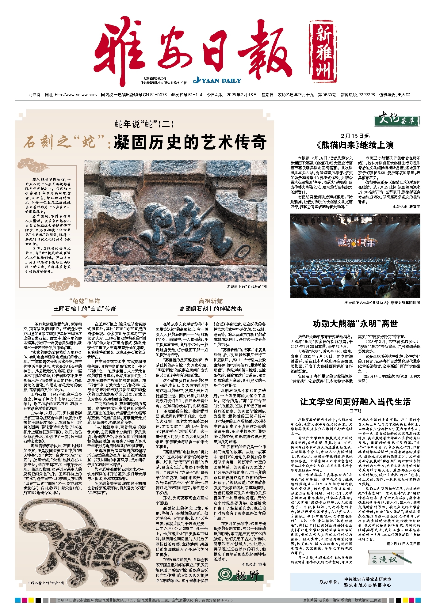 其实,在雅安的诸多文物中,与“蛇”相关的故事远不止于这面铜镜。芦山县出土的王晖石棺和雨城区高颐阙上的石刻,同样隐匿着关于蛇的神秘传奇。