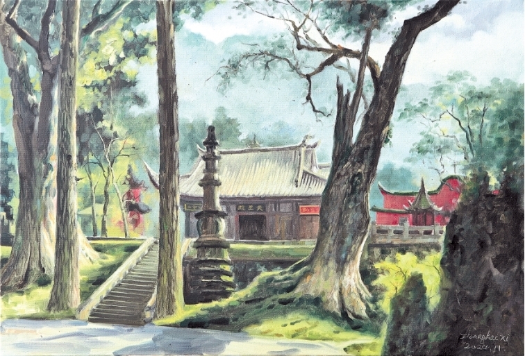 庞世明《云绕古寺》布面油画、何德忠《秋意正浓》布面油画、邱光平《楠林香气之三》布面油画……这些“抒写”古桢楠的画作,是雅安市文化馆与四川省油画学会油画名家们合作,对有着“中国最美古树”“四川省十大树王”之称的云峰山桢楠树进行采风而创作的。
