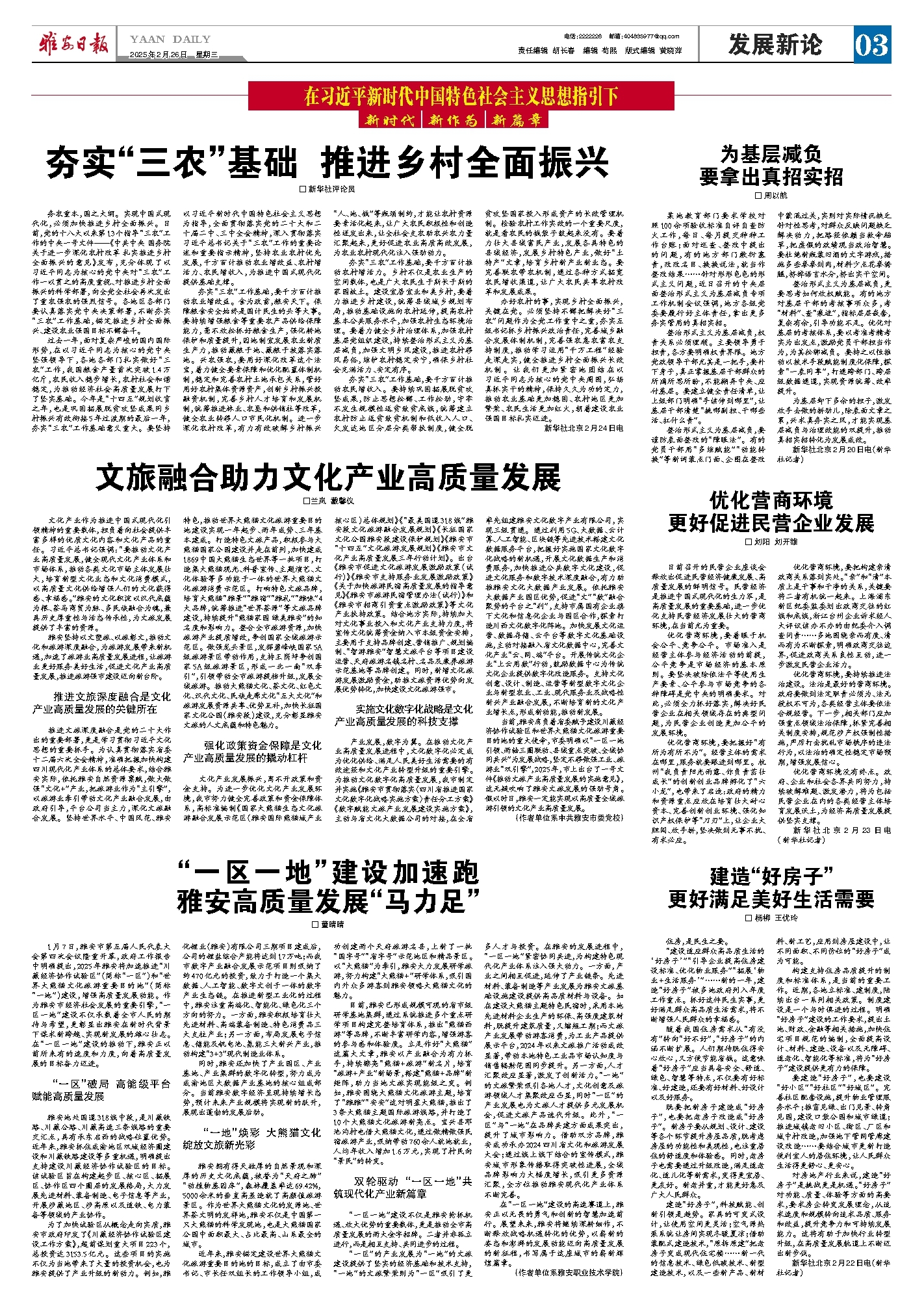 当前,雅安肩负着省委赋予建设川藏经济协作试验区和世界大熊猫文化旅游重要目的地的重大使命,市委明确以“一区一地引领、两轴三圈联动、县域重点突破、全域协同共兴”为发展战略,坚定不移做强工业、旅游业“双引擎”,2025年,市上出台了一号文件《推动文旅产业高质量发展的实施意见》,这无疑吹响了雅安文旅发展的强劲号角。假以时日,雅安一定能实现以高质量全域旅游引领的文化产业高质量发展。
