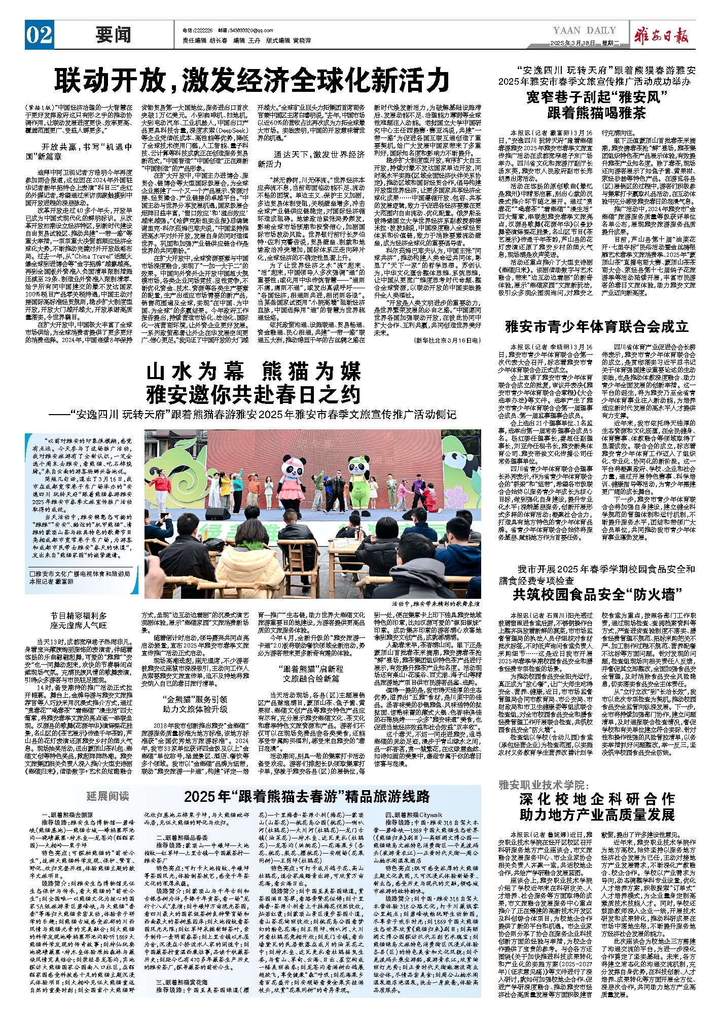 本报讯(记者 戴富丽)3月16日,“安逸四川 玩转天府”跟着熊猫春游雅安2025年雅安市春季文旅宣传推广活动在成都宽窄巷子东广场举办。四川省文化和旅游厅副厅长汤东英,雅安市人民政府副市长郑胡勇出席活动。
