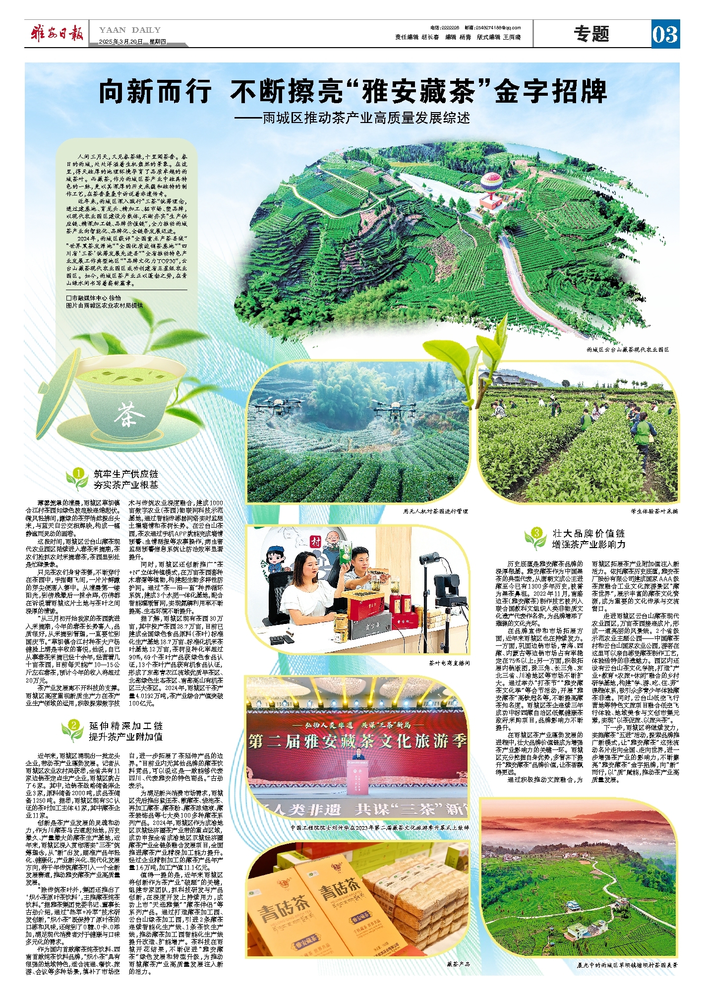 2024年,雨城区获评“全国重点产茶县域”“世界黑茶发源地”“全国优质边销茶基地”“四川省‘三茶’统筹发展先进县”“全省推动特色产业发展工作典型地区”“品牌文化力TOP30”,云台山藏茶现代农业园区成功创建省五星级农业园区。如今,雨城区茶产业正以蓬勃之势,在青山绿水间书写着崭新篇章。