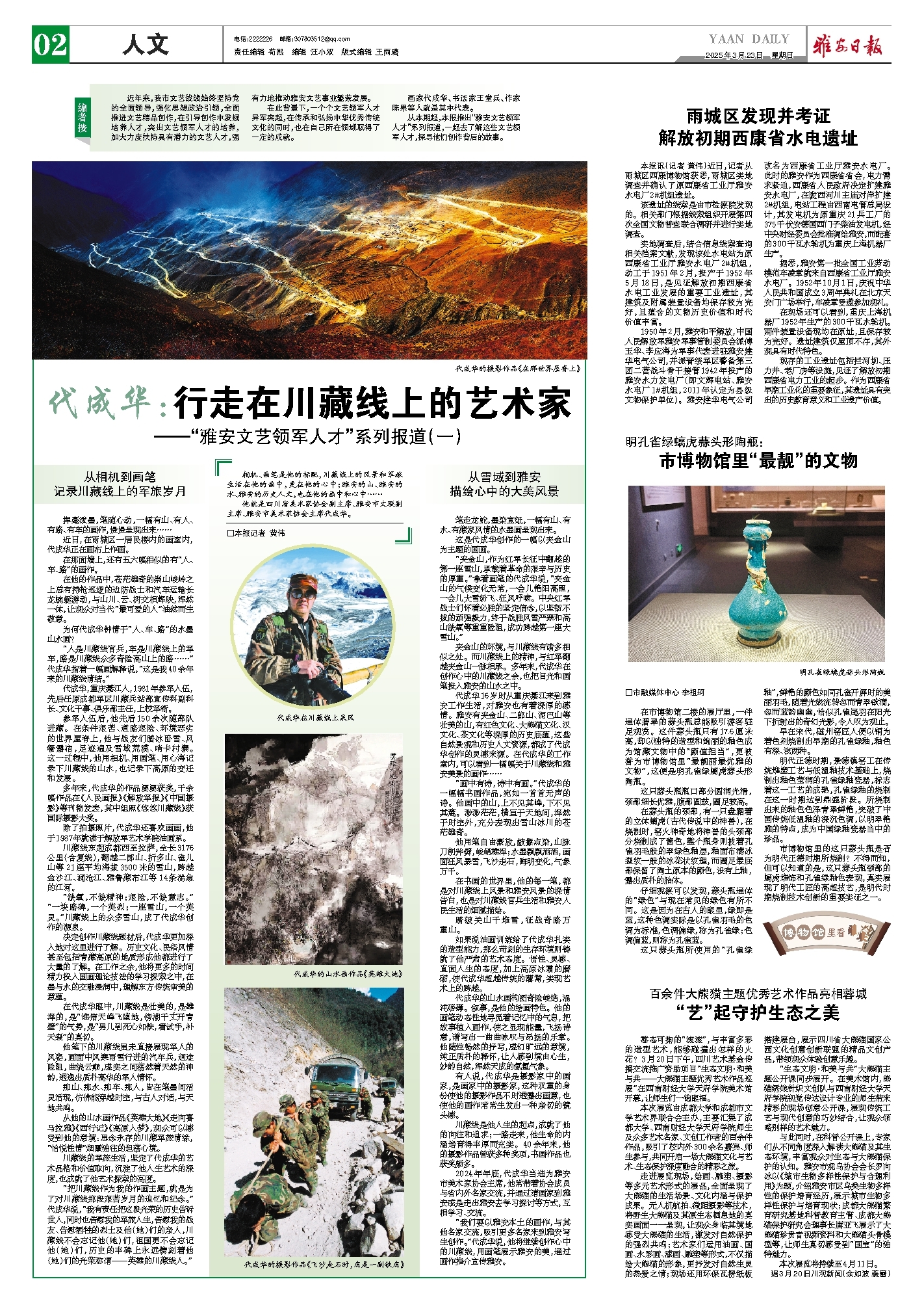 相机、画笔是他的标配,川藏线上的风景和军旅生活在他的画中,更在他的心中;雅安的山、雅安的水、雅安的历史人文,也在他的画中和心中……