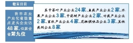据了解,我市新认定的9家农业产业化省级重点龙头企业涉及的产业类型丰富,包括茶叶、花椒、粮油、畜牧等我市农业产业发展“压舱石”的传统优势特色产业。目前,我市农业产业化省级重点龙头企业达48家,位居全省第九位。其中茶叶产业企业24家、鱼类产业企业2家、水果产业企业3家、中药材产业企业2家、竹类产业企业2家、畜牧产业企业4家、花椒调味品企业3家、其他类别企业8家。