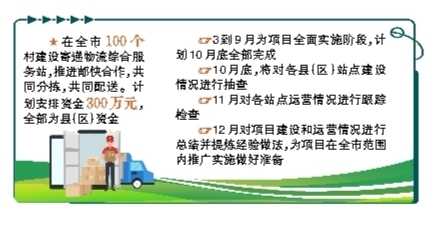 在全市100个村建设寄递物流综合服务站,推进邮快合作,共同分拣,共同配送。计划安排资金300万元,全部为县(区)资金。