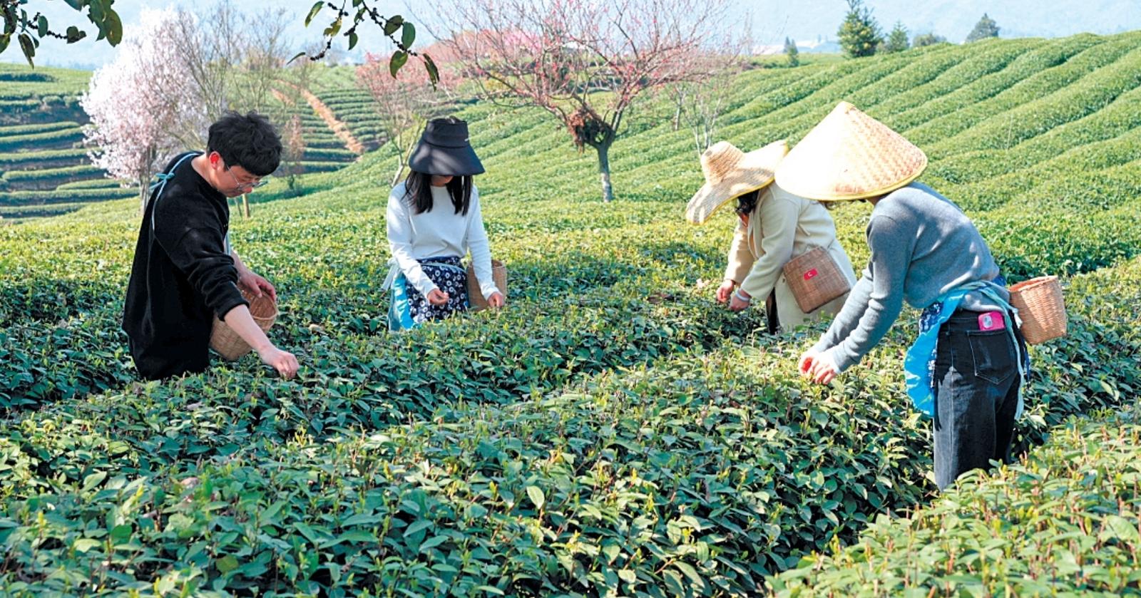 在一块茶地中,来自福建的游客何代凤埋首其间,专注地采摘茶叶。她小心翼翼地将嫩绿的茶芽掐下,再放入竹篓,脸上洋溢着收获的喜悦。“这里的茶山雅致如画,采茶过程让人身心放松,是一次难忘的旅游体验。”何代凤说。