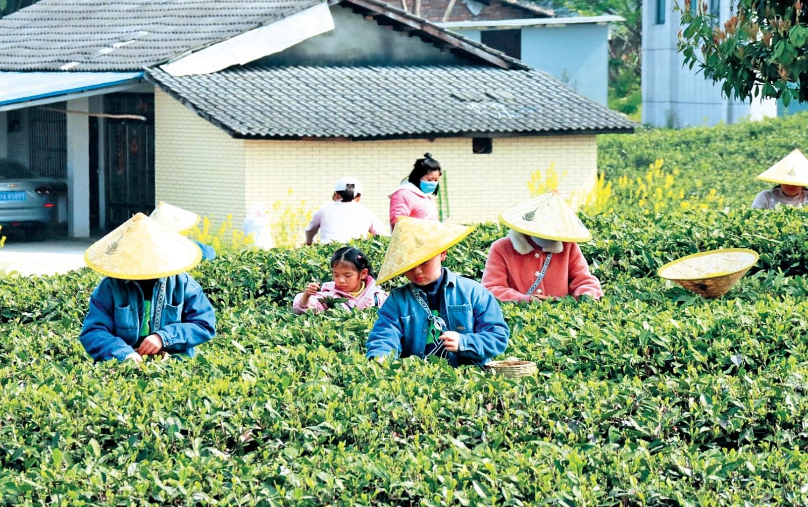 亲子家庭在茶园采茶