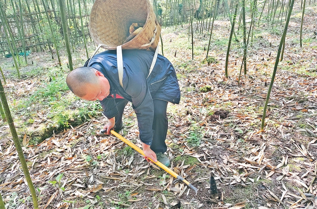 “要找雷竹密度大的地方,选大根的挖,就很轻松。但已经很高大的就不挖了,留着等它长成大竹子。”金鸡关村1组村民王凤荣一边挖一边讲起他的挖笋小技巧。