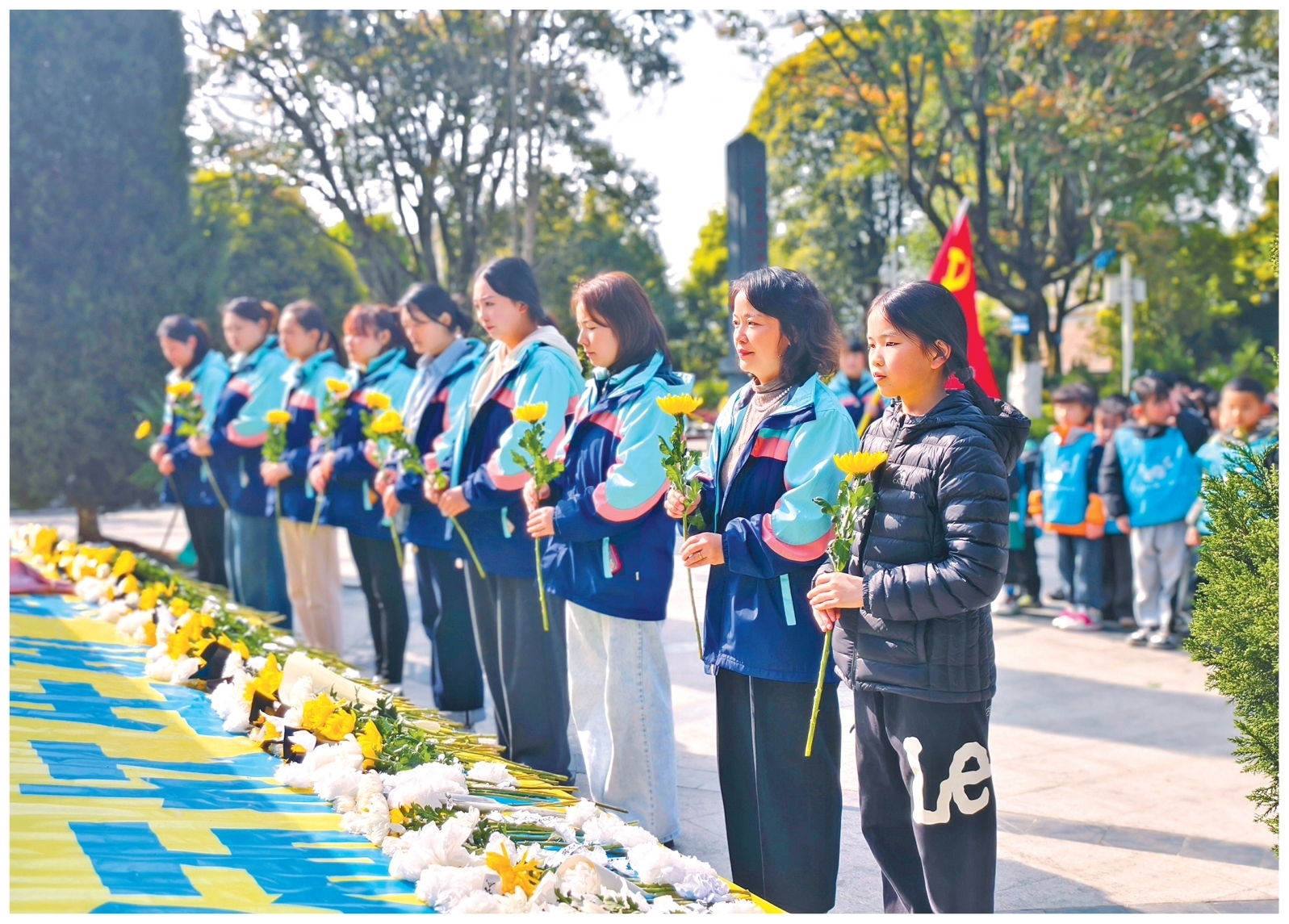 默哀结束,师生们手捧鲜花,神情庄重地走到烈士墓碑前,轻轻放下手中的花束,那一朵朵鲜花也承载着大家对烈士们无尽的敬意与深切悼念。