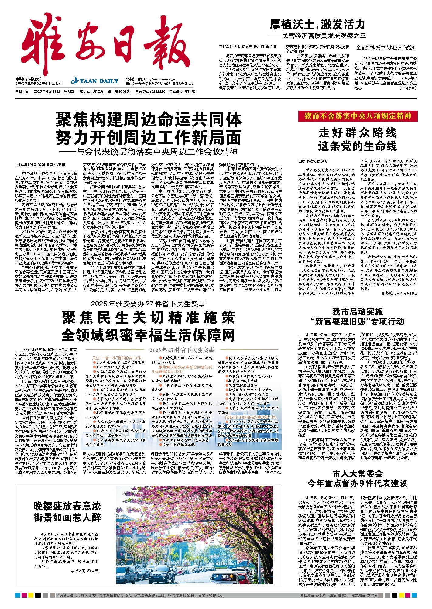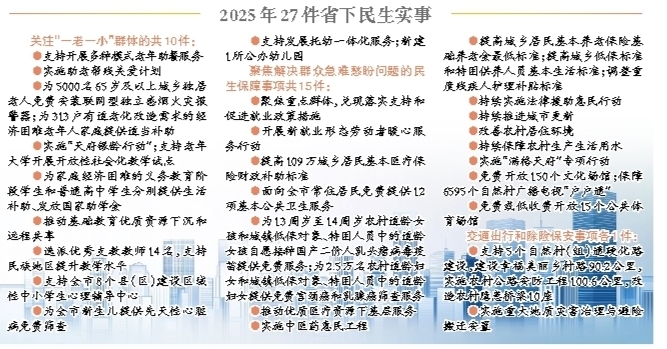 《实施方案》明确了2025年雅安要办的27件省下民生实事,涉及就业创业、教育助学、医疗卫生、养老育幼、扶弱济困、城乡宜居、交通出行、文体惠民、除险保安领域。总体来看,27件民生实事涵盖领域全面,既兜牢基本民生底线又提升品质覆盖维度,既立足当前急难愁盼又着眼长远体系建设,充分彰显了以人民为中心的发展思想。
