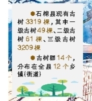 据统计,石棉县现有古树3319棵,其中一级古树49棵、二级古树61棵、三级古树3209棵,并有古树群14个,分布在全县12个乡镇(街道)。