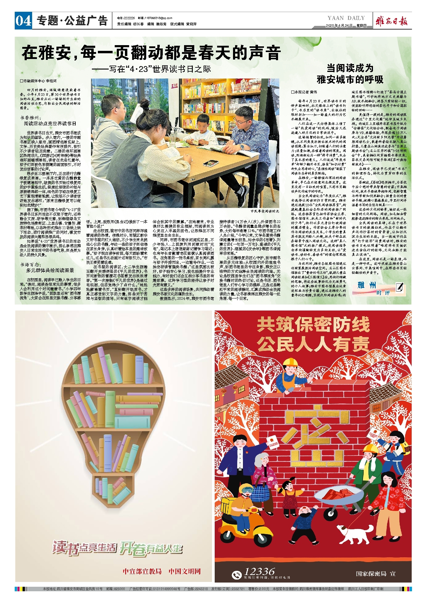 如果说“4·23”世界读书日的活动是全民阅读的集中展示,那么渗透在雅安人日常生活中的书香气息,则是更为动人的持久风景。