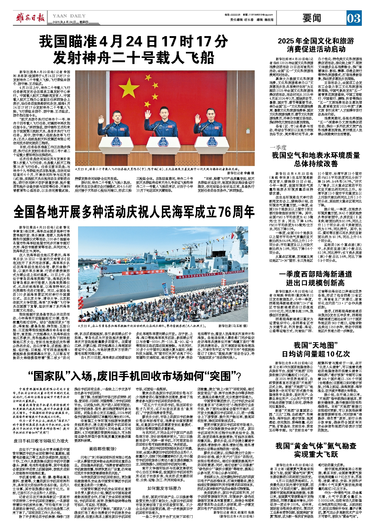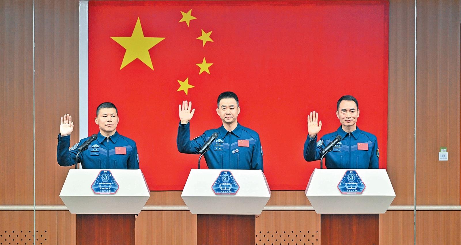 4月23日,神舟二十号载人飞行任务航天员陈冬(中)、陈中瑞(右)、王杰在酒泉卫星发射中心问天阁与媒体记者集体见面。 新华社记者 李鑫 摄