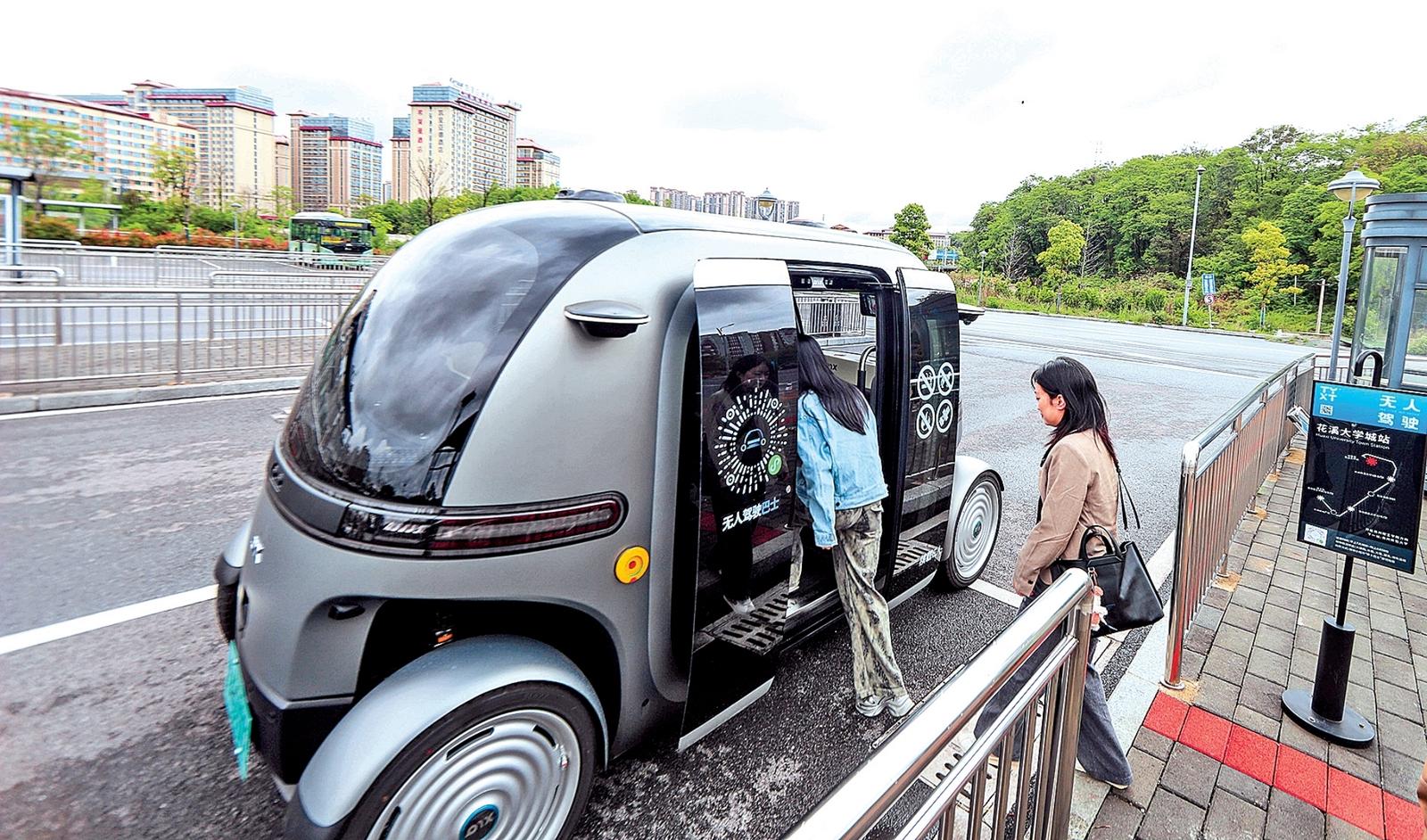 4月24日,参与体验活动的市民在贵阳市花溪大学城公交车站试乘无人驾驶公交车。 目前,贵州首条无人驾驶公交车线路正在紧张试运营中,并将于近期在贵阳市花溪大学城区域开通运营。目前该条线路全程预计约5公里,设有4个站点,通车后为市民的日常出行提供了更多选择,有效缓解城市交通压力。