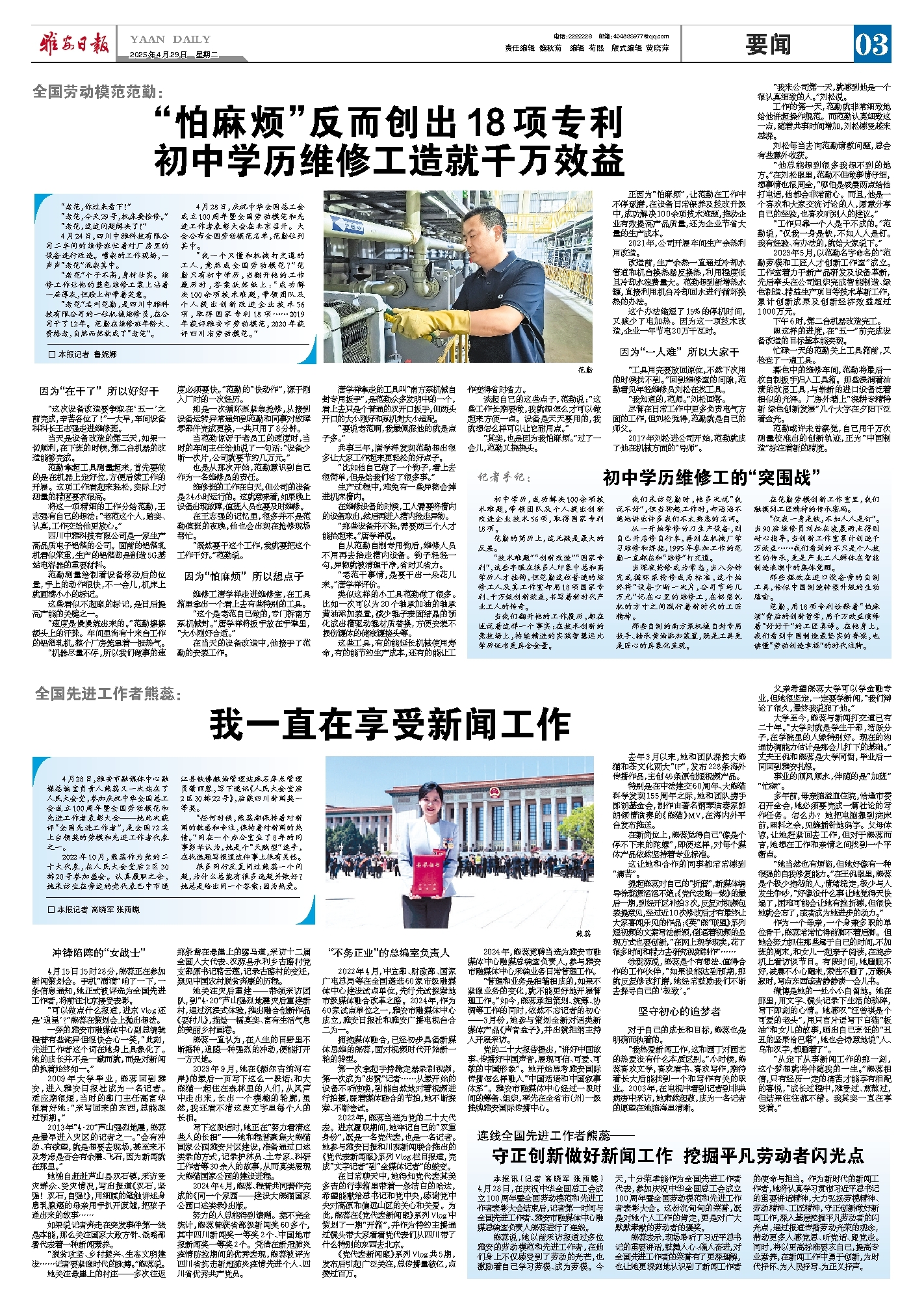 本报讯(记者 高晓军 张雨蝶)4月28日,在庆祝中华全国总工会成立100周年暨全国劳动模范和先进工作者表彰大会结束后,记者第一时间与全国先进工作者、雅安市融媒体中心融媒总编室负责人熊蕊进行了连线。