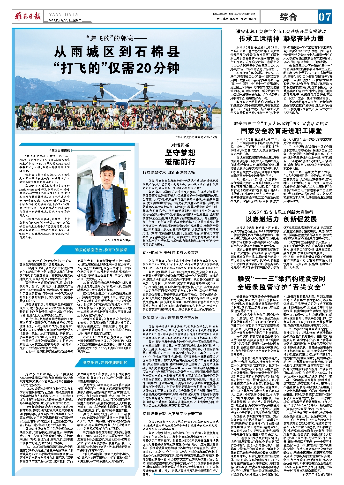 “这是我们公司目前唯一的产品,AE200飞行汽车。”4月10日,在沃飞长空的展厅中央,一架1:4等比例AE200模型静静伫立。一旁,雅安人郭亮的脸上写满自豪。
