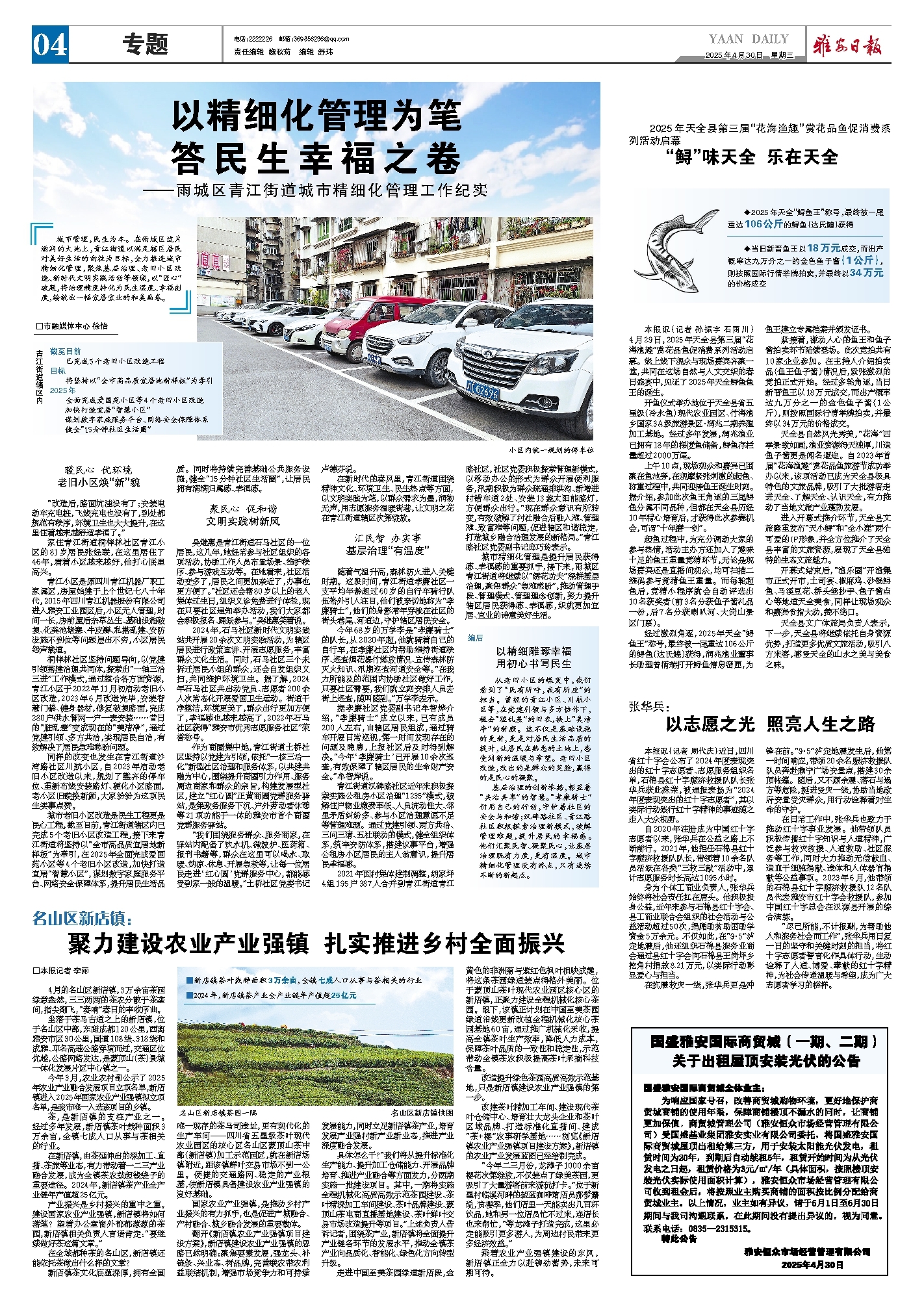 城市管理,民生为本。在雨城区这片滋润的大地上,青江街道以满足辖区居民对美好生活的向往为目标,全力推进城市精细化管理,聚焦基层治理、老旧小区改造、新时代文明实践活动等领域,以“匠心”破题,将治理精度转化为民生温度、幸福刻度,绘就出一幅宜居宜业的和美画卷。