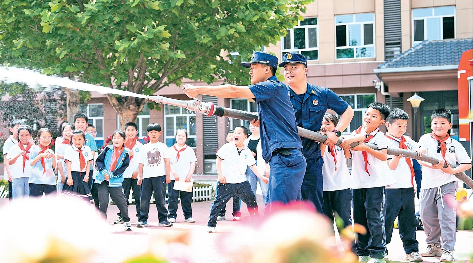 5月12日,在河北省石家庄市北郡小学,石家庄市新华区消防救援大队消防员为学生们展示高压灭火水枪。 5月12日是第17个全国防灾减灾日,各地展开学习应对灾难知识活动。