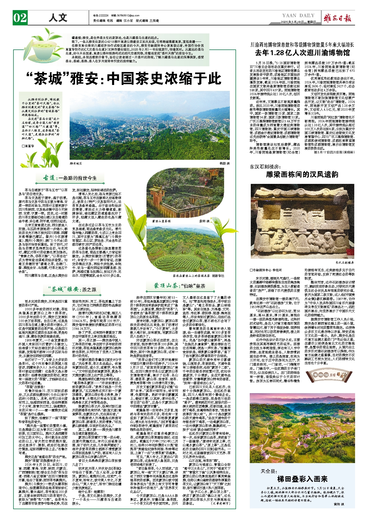 2000多年前的西汉时期,茶祖吴理真在蒙顶山上种7株茶树。2000多年后的今天,雅安已发展到100余万亩茶园。自古以来,这里是四川茶马古道上最大的茶叶源头,不仅是中国重要的边茶产地,还是四川盆地向高原过渡的生态阶梯,更是沟通川、滇、藏各民族的地缘走廊。