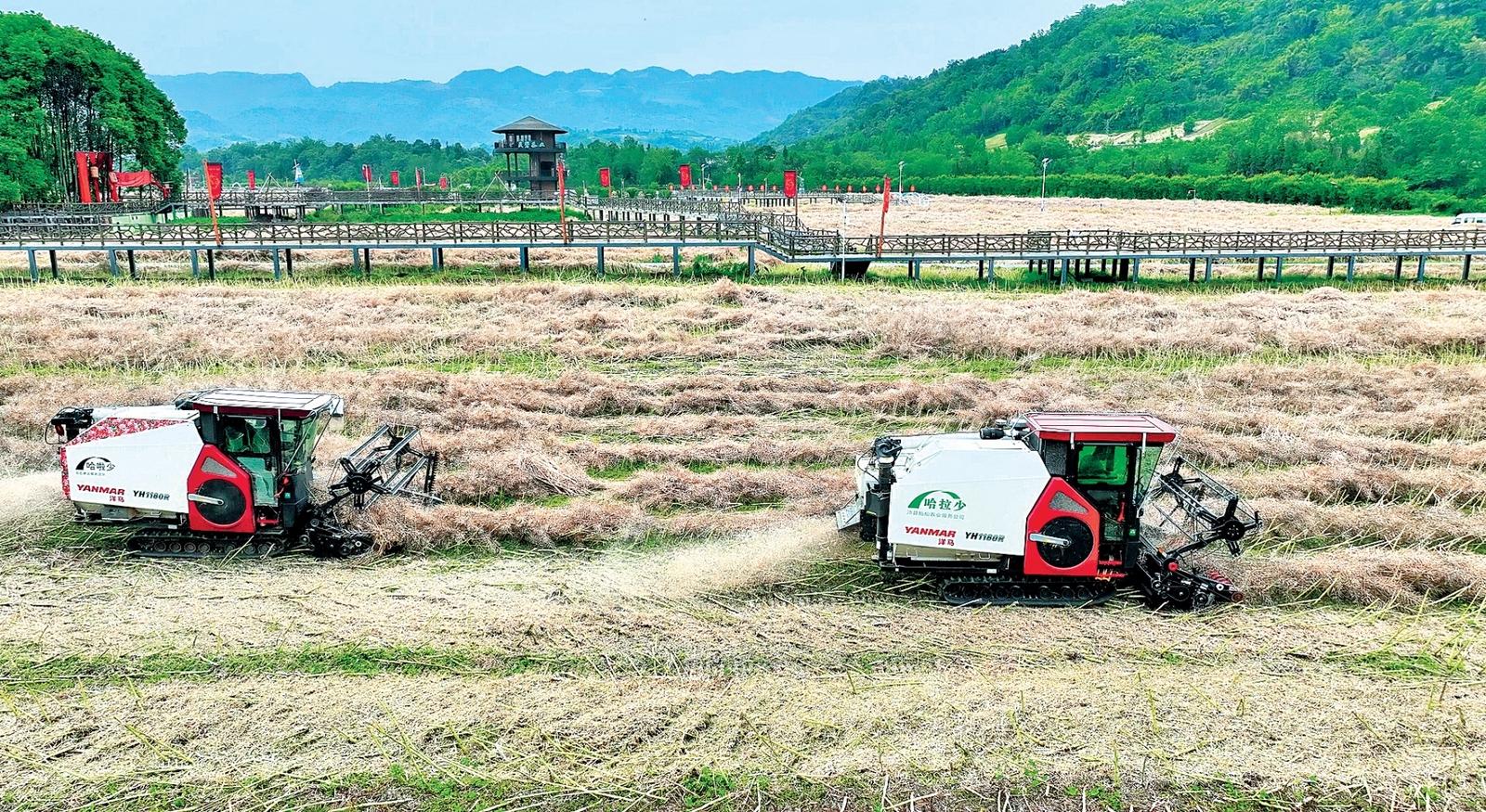 “青衣芸谷300亩油菜田采用‘两段式’收割工艺,目前正进行机械化捡拾脱粒作业。预计平均亩产油菜籽达150公斤,总出油量约15吨,综合产值可达80万元至100万元。”芦山县万亩粮经复合园种植顾问巴雄军说。