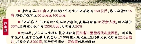 依托油菜花的美丽景观,芦山县成功打造了集观光、休闲、体验于一体的乡村旅游景点,通过举办“油菜花开·七里夺标”民俗活动,吸引了大量游客前来打卡游玩。300亩七彩油菜花田撬动了春日文旅消费,让附近的村民吃上了旅游饭,真正让“花经济”结出“共富果”。