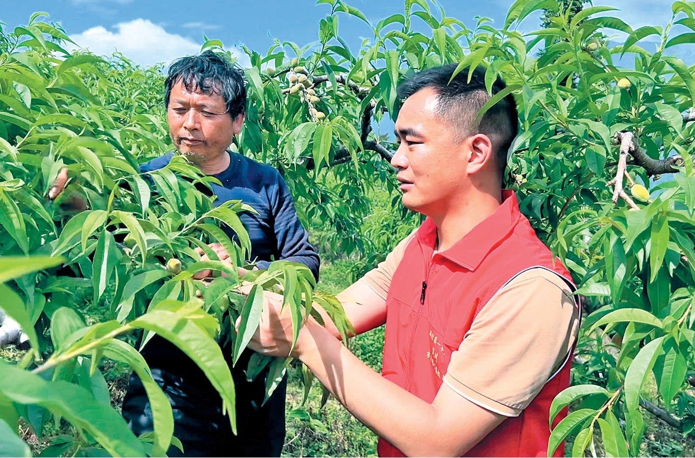 解放村猕猴桃基地两三公里外,黄桃幼果挂满枝头,村民王青琴和丈夫正穿梭其间忙着疏果。周川一走进果园,便热情地和他们打招呼,随即挽起袖子,帮忙疏果。