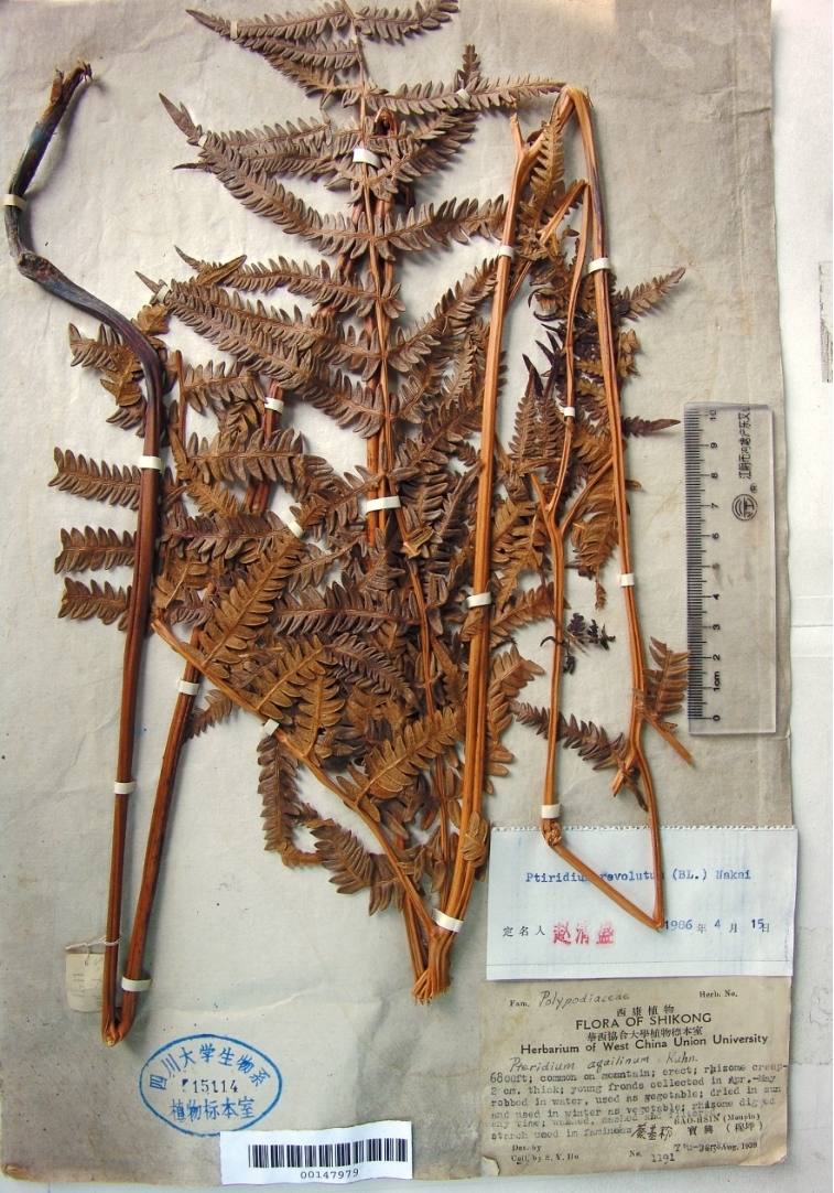毛轴蕨标本,胡秀英1939年7月采集于宝兴县