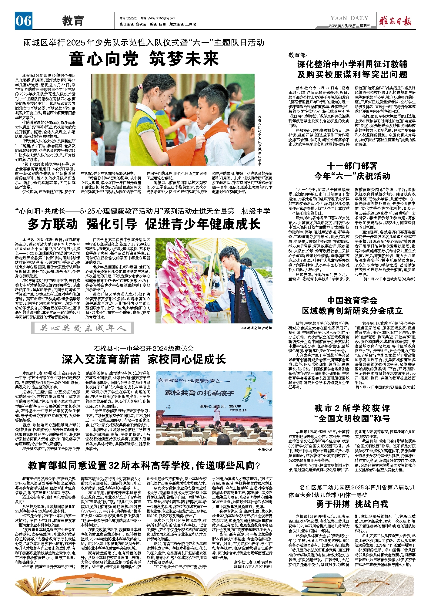 本报讯(记者 郑暘)为增强少先队员光荣感、归属感,更好地教育引导少年儿童听党话、跟党走,5月27日,以“牢记党的教导 争做强国少年”为主题的2025年少先队示范性入队仪式暨“六一”主题队日活动在雨城四小教育集团新华校区举行。此次活动由共青团雅安市雨城区委、雨城区教育局、雨城区少工委主办,雨城四小教育集团新华校区承办。