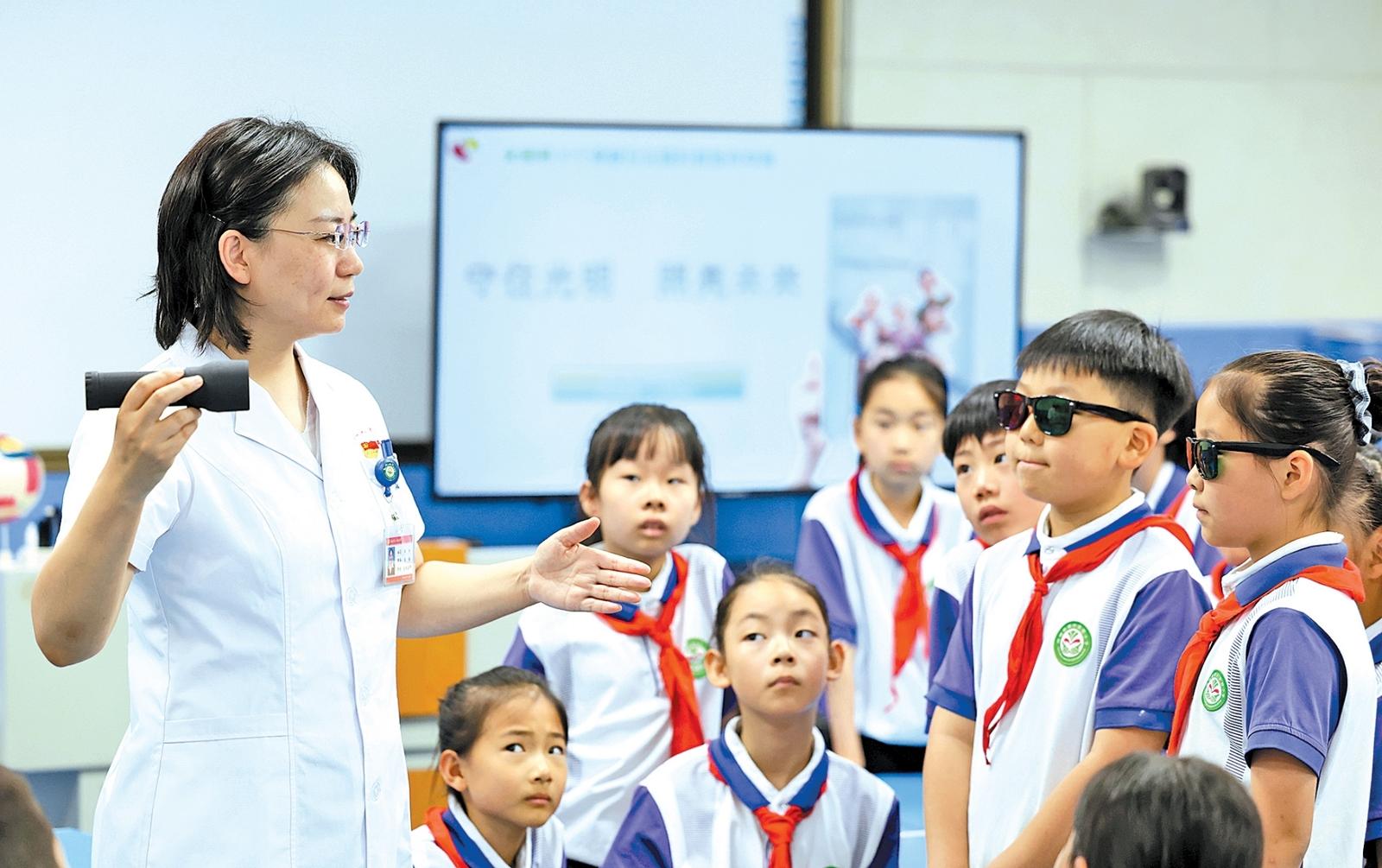 6月5日,山东省临沂市郯城县第六实验小学开展“爱眼知识进课堂”活动,郯城县第一人民医院眼科医生为小学生检查视功能。 全国爱眼日将至,各地开展形式多样的活动,普及健康用眼知识,增强爱眼护眼意识。