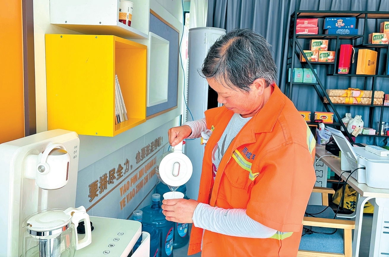 “现在天气越来越热。”李兴丽抹去汗水,捧着水杯对记者说, “有时候我们搞完清洁工作,会来这里喝水,这里还有藏茶可以泡来喝,挺好的。” 外卖小哥陈鑫在驿站稍作休息后准备离去,他表示:“中午送单高峰期过了,有个地方歇歇脚、吹会儿空调,喝点茶,感觉好多了。”