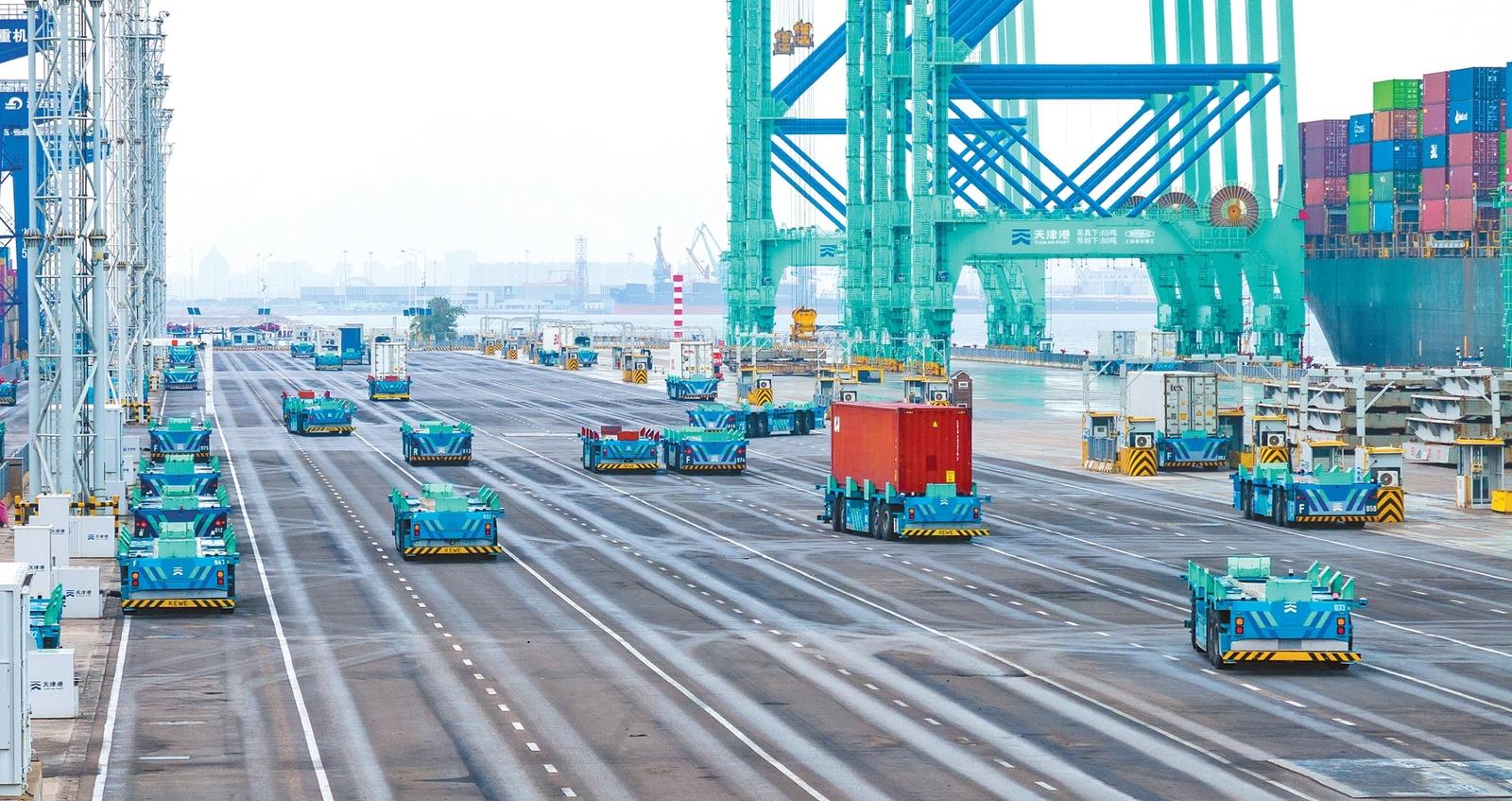 6月19日,智能水平运输机器人行驶在天津港第二集装箱码头(无人机照片)。 作为我国港口智慧化转型的“试验田”,近年来天津港持续推动传统码头全流程自动化升级,打造智慧绿色枢纽港口升级版。 据介绍,传统码头一条作业线每班至少需要1名岸桥司机、2名场桥司机和6至7名拖车司机。而经过自动化升级的码头仅需1到2人进行远程监控,即可完成全部工作。在人力大幅精简的同时,码头整体作业效率也得到了显著提升。 目前,天津港已实现集装箱与干散货码头智能化改造全覆盖,大型集装箱设备自动化率超88%,平均作业效率提升15%。