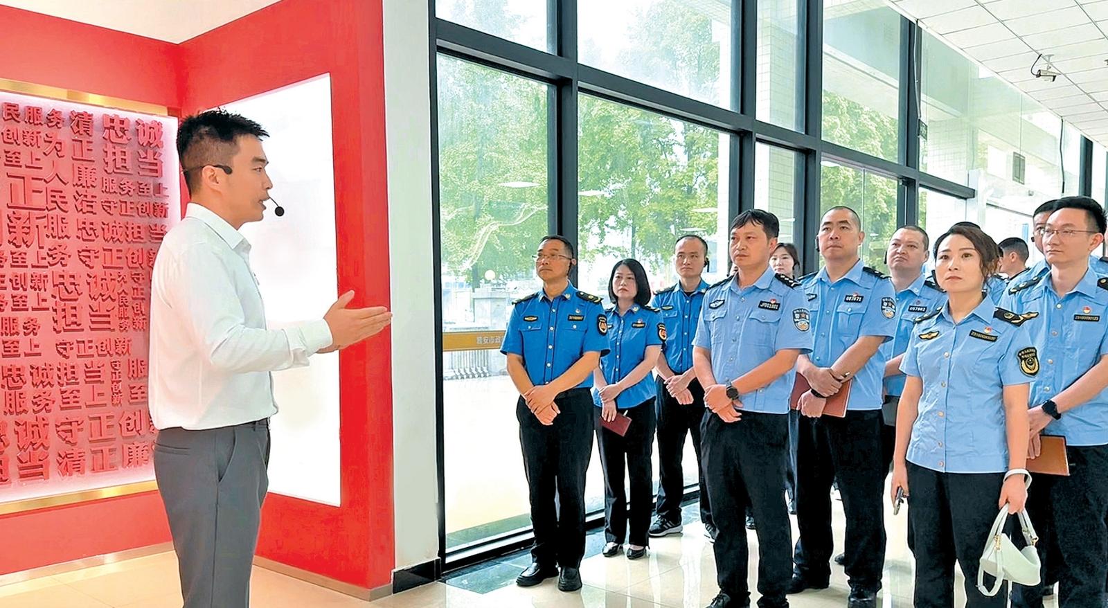 第二站,党员们走进市公安局机关党建示范点,市公安局民警王艺翰带领大家参观党建小苑、党建文化长廊,深入了解市公安局“1+3+9+N”机关党建品牌体系、“一红一绿一黑白”特色党建文化长廊、雅安公安特色党建“三五体系”以及党建活动室,学习党建与业务深度融合的先进经验。