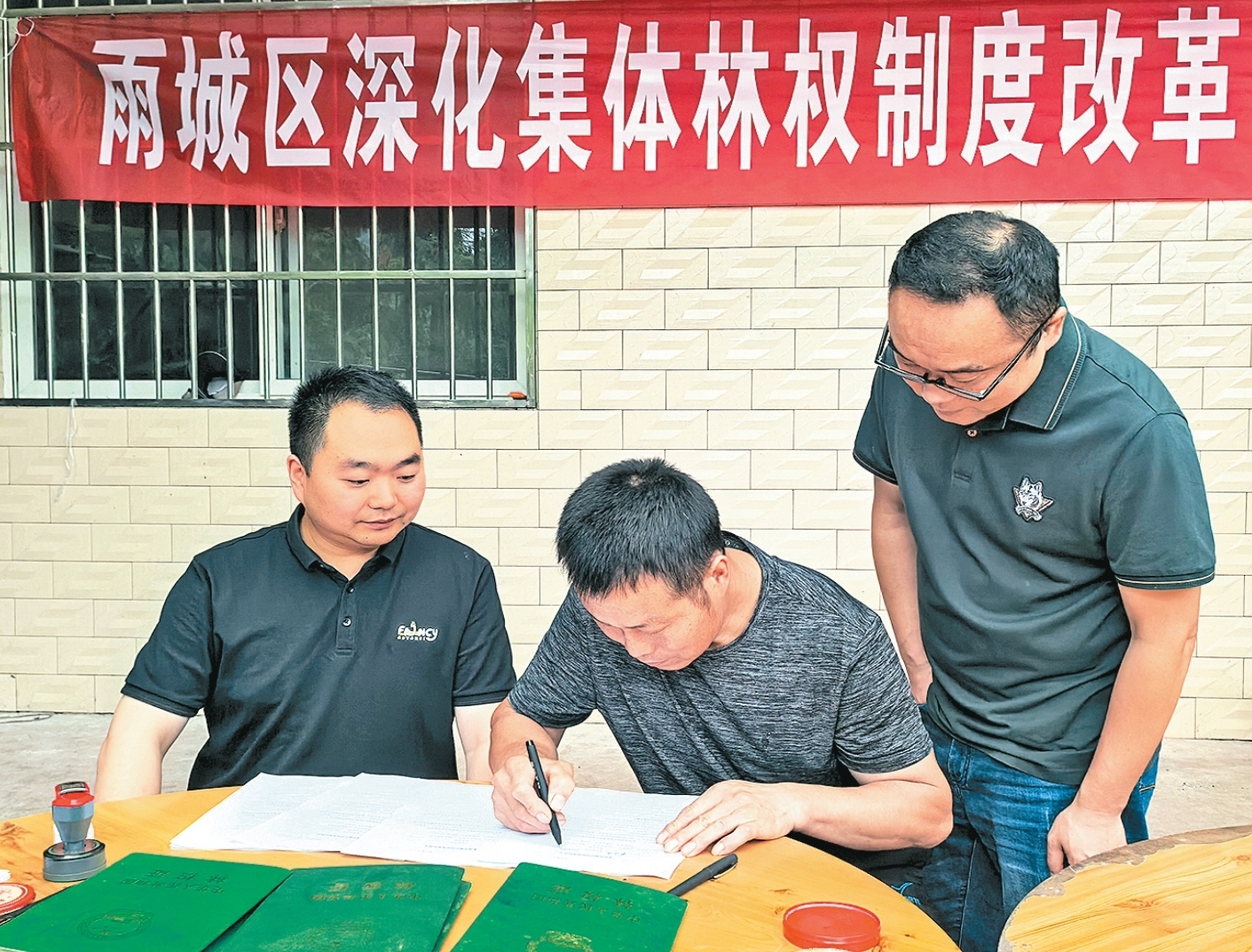 桑作友家的院子里此时已经坐满了人,吴明琴找了根凳子坐下。她抬头,看见院子里刚拉的横幅上写着“雨城区深化集体林权制度改革——集体林地经营权预流转集中签约”。