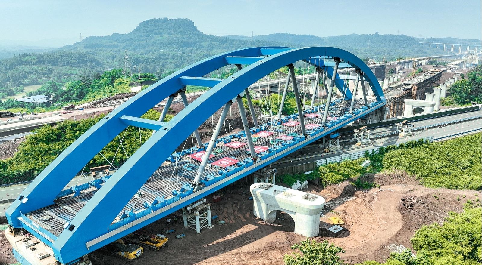 7月11日,由中铁四局承建的西渝高铁跨营达高速公路大桥主体平稳落在桥墩上,标志着全国首座高铁大跨度网状吊杆系杆拱桥顶推施工完成,为全线按期通车奠定了坚实基础。
