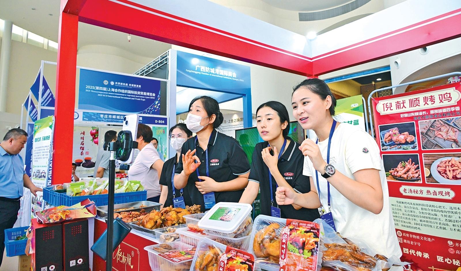 7月18日,一家参展商在2025上海合作组织国际投资贸易博览会上直播。当日,以“共享新机遇、共谋新发展”为主题的2025上海合作组织国际投资贸易博览会在青岛开幕。