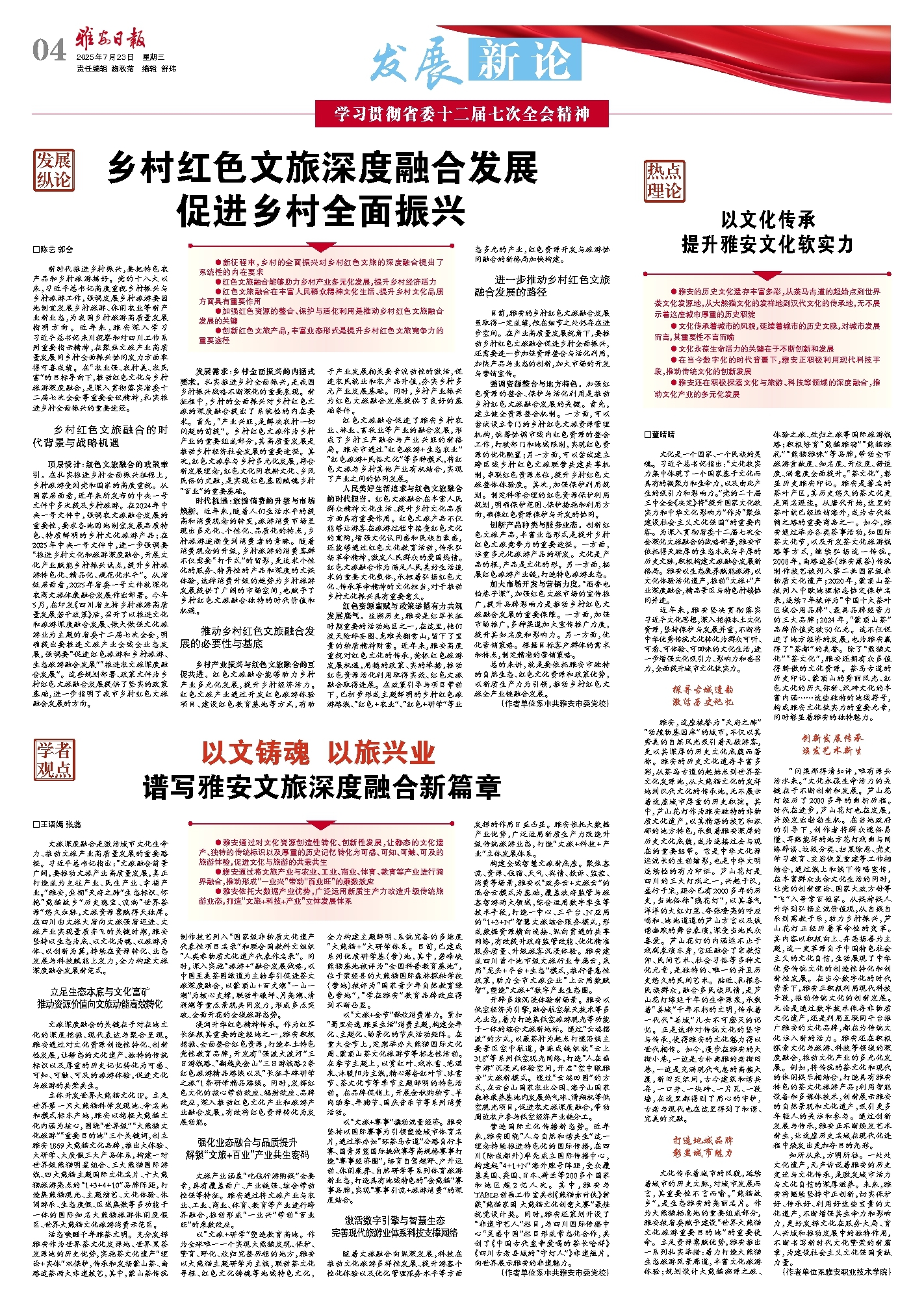 浸润升华红色精神传承。作为红军长征极其重要的途经地之一,雅安积极挖掘、全面整合红色资源,打造本土特色党性教育品牌,开发有“强渡大渡河”三日游线路、“翻越夹金山”三日游线路2条红色旅游精品路线以及“长征丰碑研学之旅”1条研学精品路线。同时,发挥红色文化的核心带动效应、辐射效应、品牌效应,深入推动红色文化产业和旅游产业融合发展,有效将红色资源转化为发展动能。