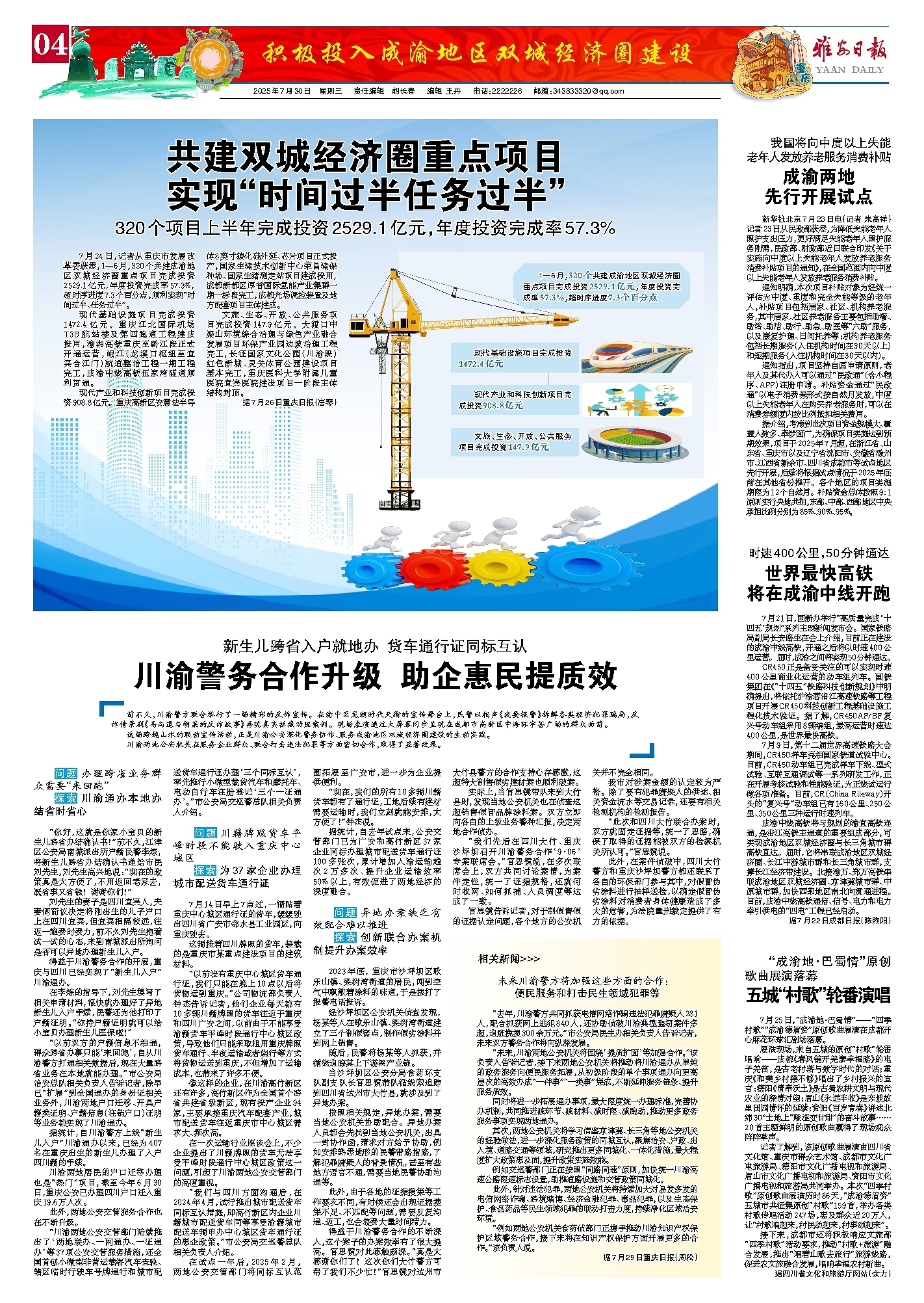 7月24日,记者从重庆市发展改革委获悉,1—6月,320个共建成渝地区双城经济圈重点项目完成投资2529.1亿元,年度投资完成率57.3%,超时序进度7.3个百分点,顺利实现“时间过半、任务过半”。