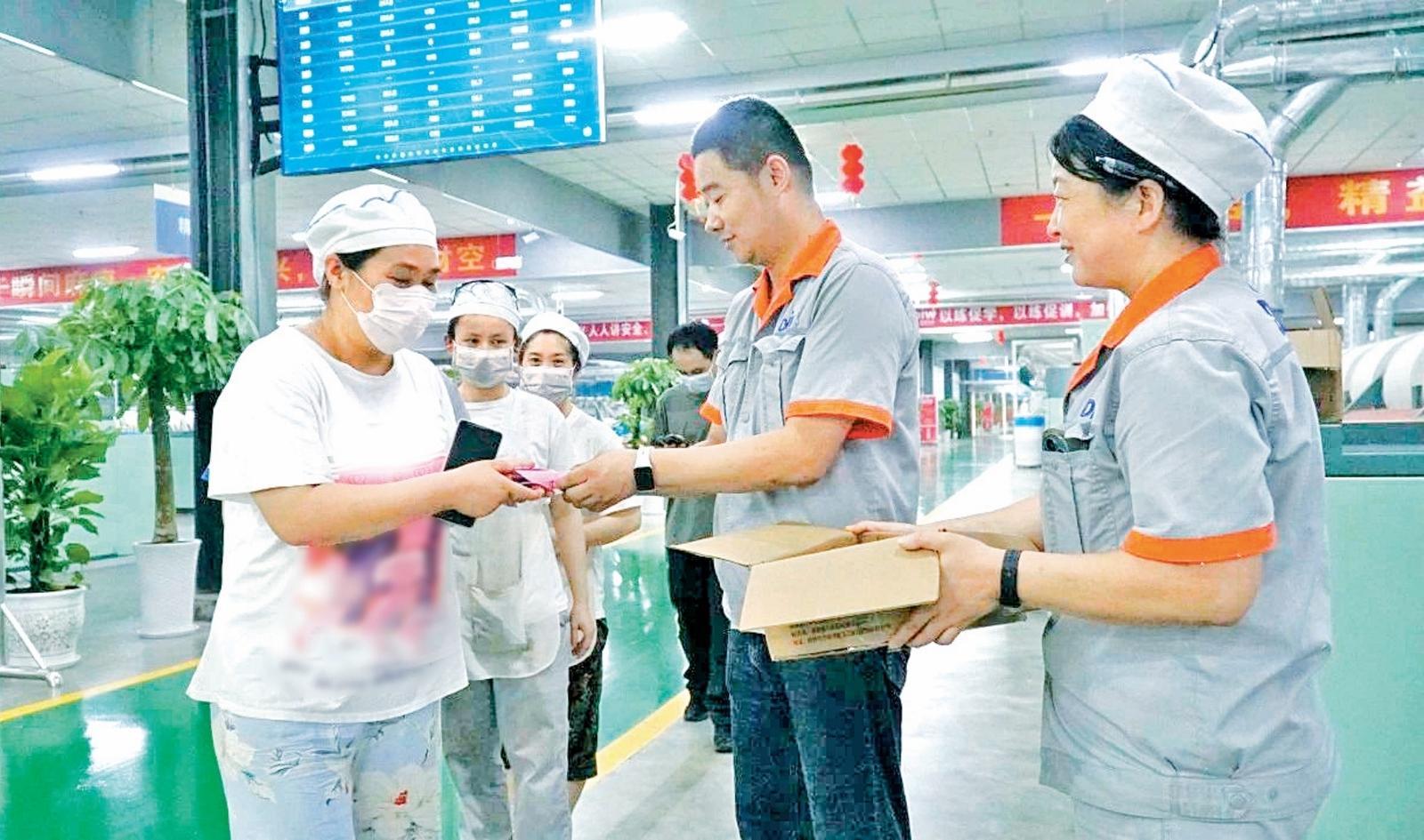 “每天下午都有冰淇淋,食堂的绿豆汤、西瓜从不间断,藿香正气水这些防暑药品也一直备着。”纺织女工李大姐手里攥着刚领的防暑物资说。