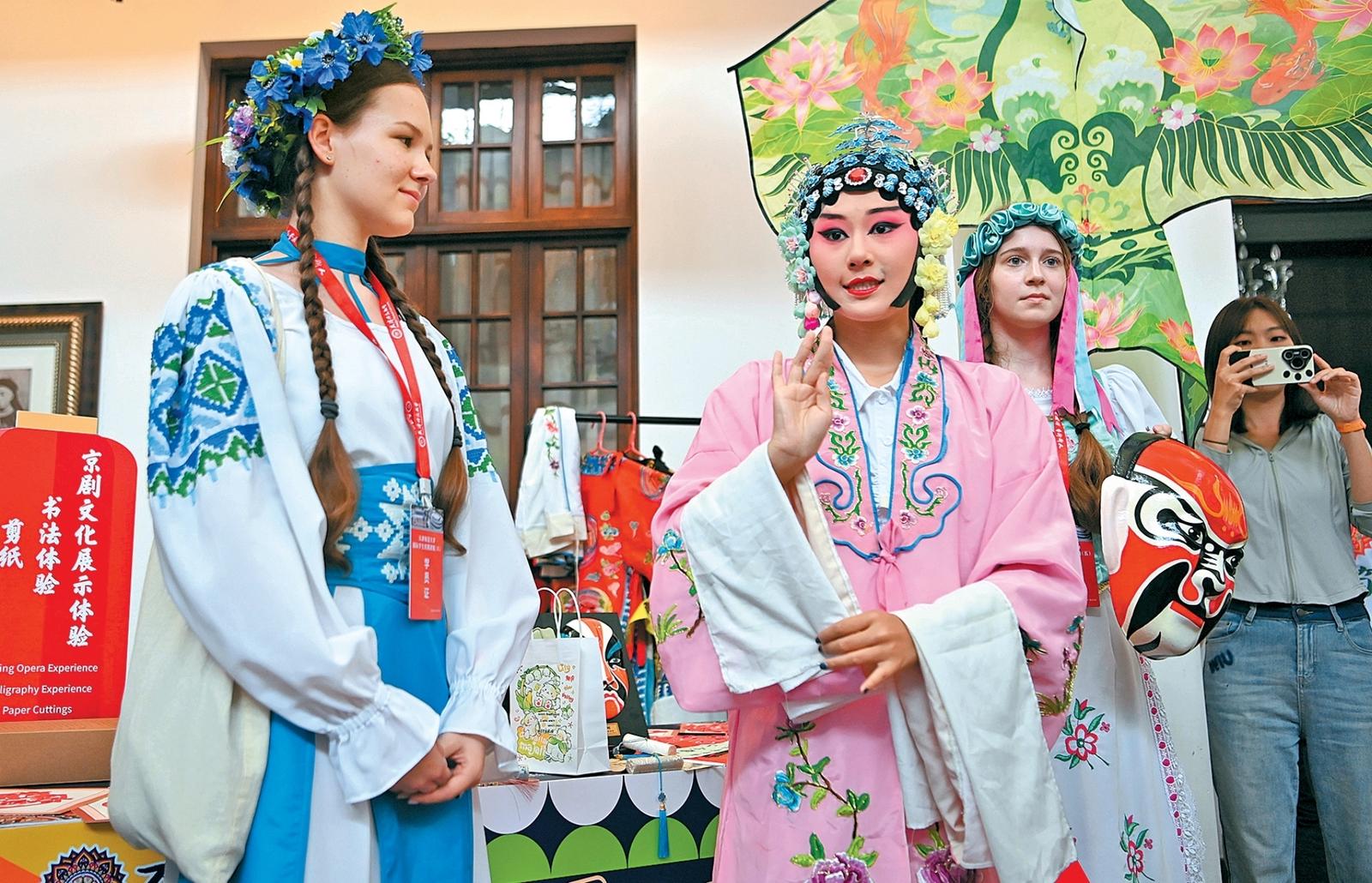 8月6日,上合国家青年学生在体验京剧艺术。当日,由中国教育部中外语言交流合作中心、天津市教育委员会、天津市人民政府外事办公室联合主办的“上合之约·丝路津彩”上合国家青年学生“万花筒”文化市集在天津庆王府举行。活动现场,来自中国、俄罗斯、乌兹别克斯坦等上合国家的数百位青年学生汇聚一堂,通过文化展示与体验、文艺演出等形式感受多元文化魅力。