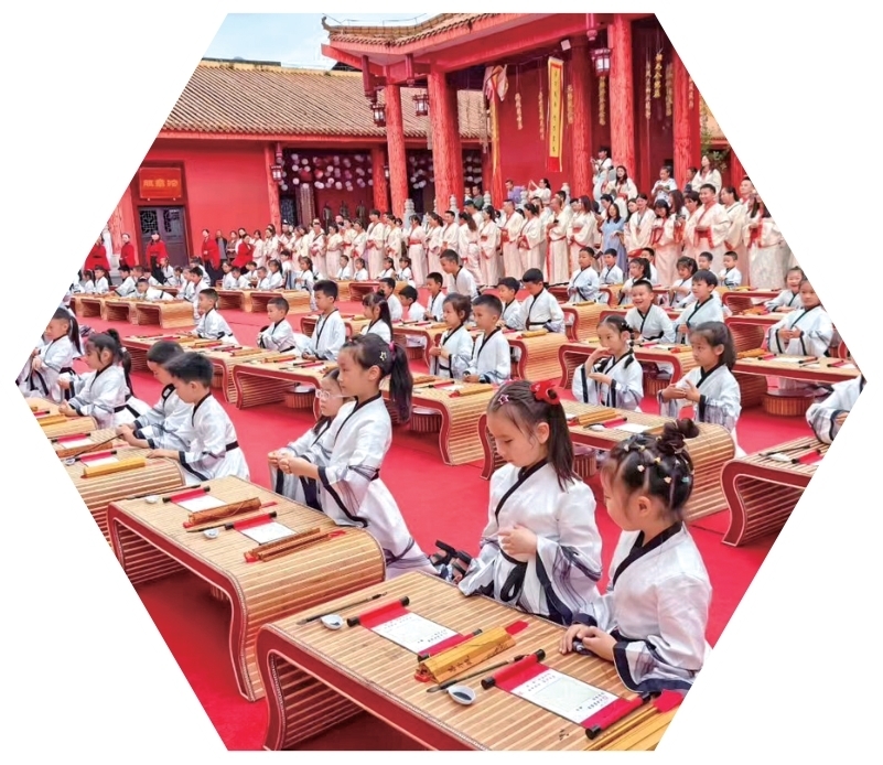 开放仅两年,这里已举办数百场传统礼仪活动:从“开笔礼”到“成童礼”,从“成人礼”到“尊师礼”,千年儒家礼制在现代教育体系中重焕生机。成童礼上,孩子们净手后有序入场,迎鼓觐圣,为先师孔子献六礼、行三拜之礼,再向父母跪拜叩首……每年9月,芦山中学的成人礼在此举办;元旦时,这里还会举行年轻人的中式集体婚礼。