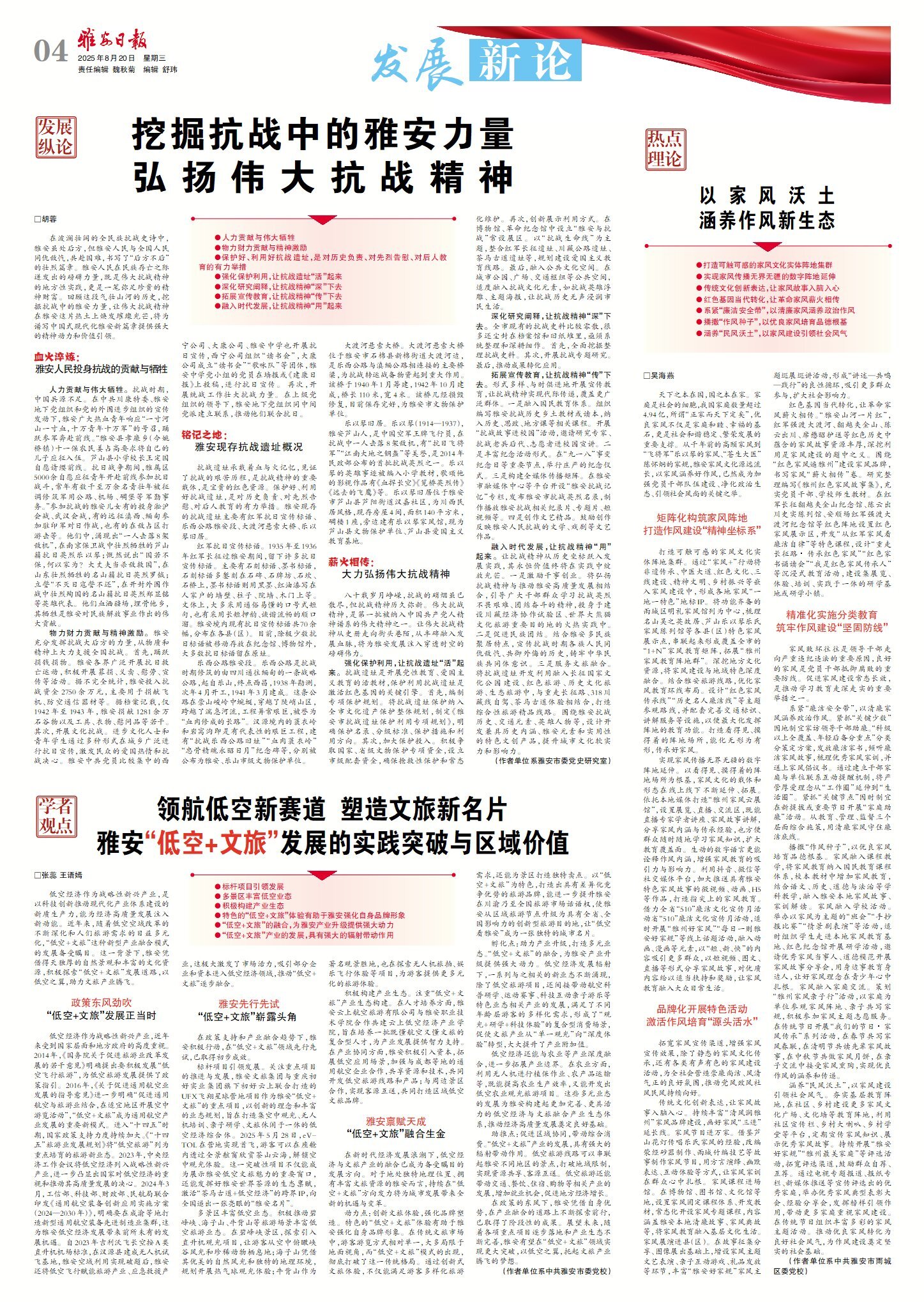 融入时代发展,让抗战精神“用”起来。让抗战精神从历史坐标跃入发展实践,其永恒价值终将在实践中绽放光芒。一是激励干事创业。将弘扬抗战精神与推动雅安高质量发展相结合,引导广大干部群众学习抗战英烈不畏艰难、团结奋斗的精神,投身于建设川藏经济协作试验区、世界大熊猫文化旅游重要目的地的火热实践中。二是促进民族团结。结合雅安多民族聚居特点,宣传抗战时期各族人民同仇敌忾、共御外侮的历史,铸牢中华民族共同体意识。三是服务文旅融合。将抗战遗址开发利用融入长征国家文化公园建设、红色旅游、历史文化旅游、生态旅游中,与重走长征路、318川藏线自驾、茶马古道体验相结合,打造综合性旅游精品线路。围绕雅安抗战历史、交通元素、英雄人物等,设计开发兼具历史内涵、雅安元素和实用性的特色文创产品,提升城市文化软实力和影响力。