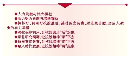 深化研究阐释,让抗战精神“深”下去。全市现有的抗战史料比较零散,很多还尘封在档案馆和旧纸堆里,亟须系统整理和深耕细作。首先,全面挖掘整理抗战史料。其次,开展抗战专题研究。最后,推动成果转化应用。