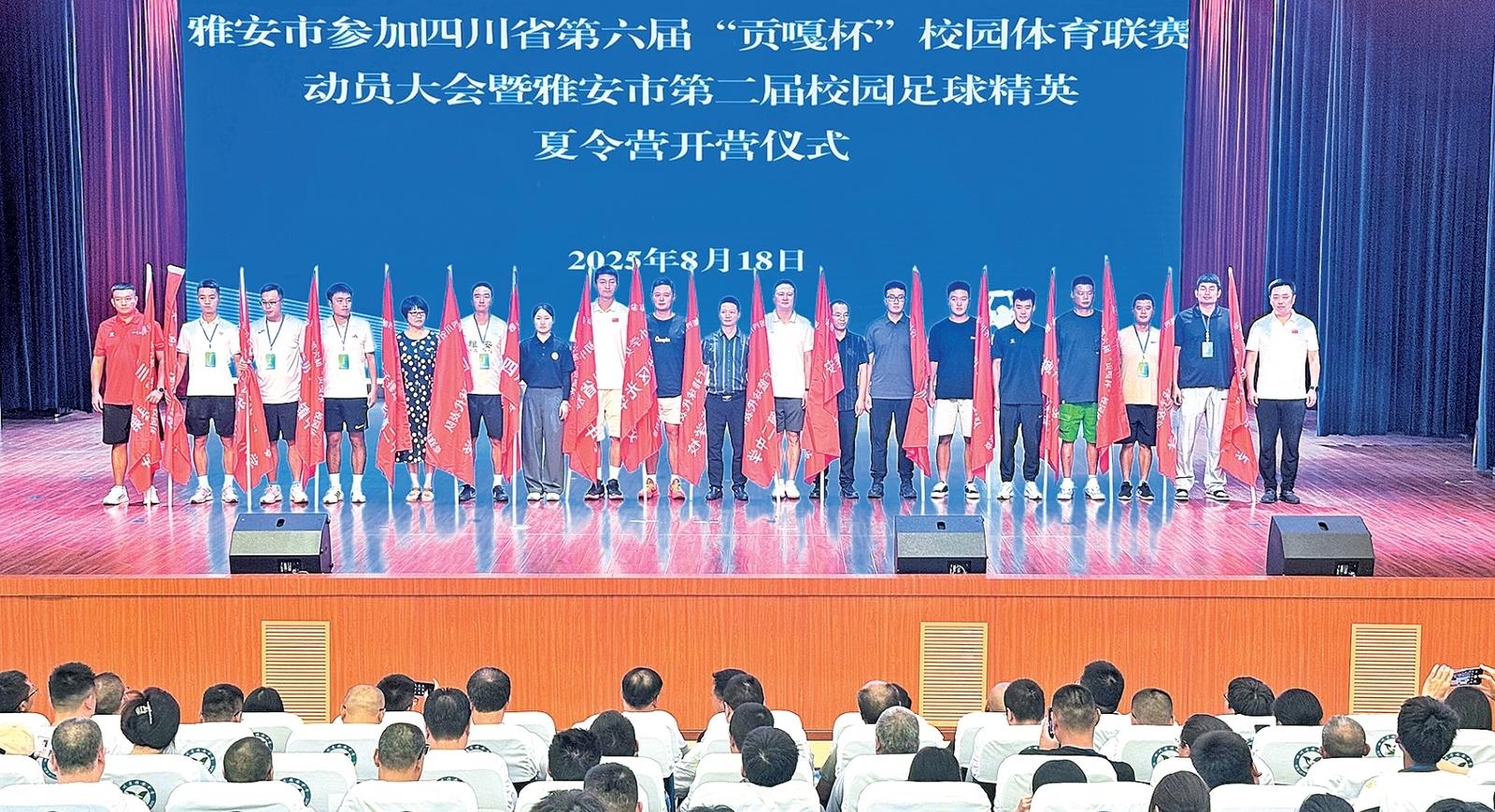 本报讯(记者 郑暘)8月18日,雅安市参加四川省第六届“贡嘎杯”校园体育联赛动员大会暨雅安市第二届校园足球精英夏令营开营仪式在雅安中学举行。18支参赛队伍、各县(区)教育局及相关体育协会代表共聚一堂,为代表我市参加四川省第六届“贡嘎杯”青少年校园体育联赛的队伍加油鼓劲。