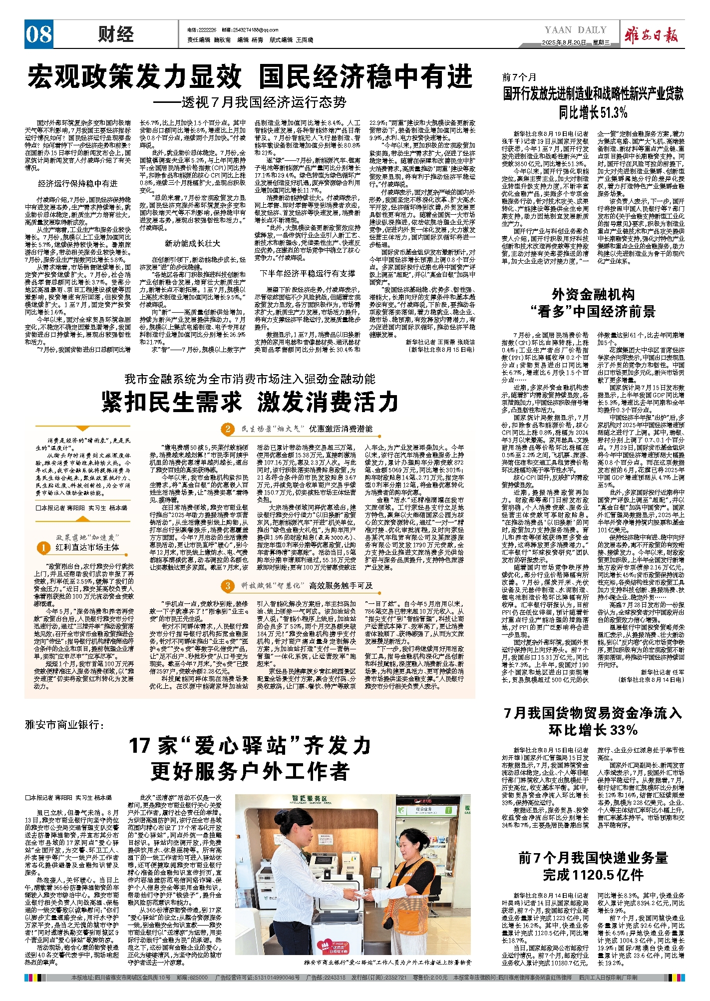 保持经济稳中有进、稳中向好的发展态势,离不开政策的有效衔接、接续发力。今年以来,财政政策更加积极,上半年全国发行新增地方政府专项债券2.16万亿元,同比增长45%;货币政策保持流动性充裕,各类结构性货币政策工具加力支持科技创新、提振消费、扶持小微企业、稳定外贸……