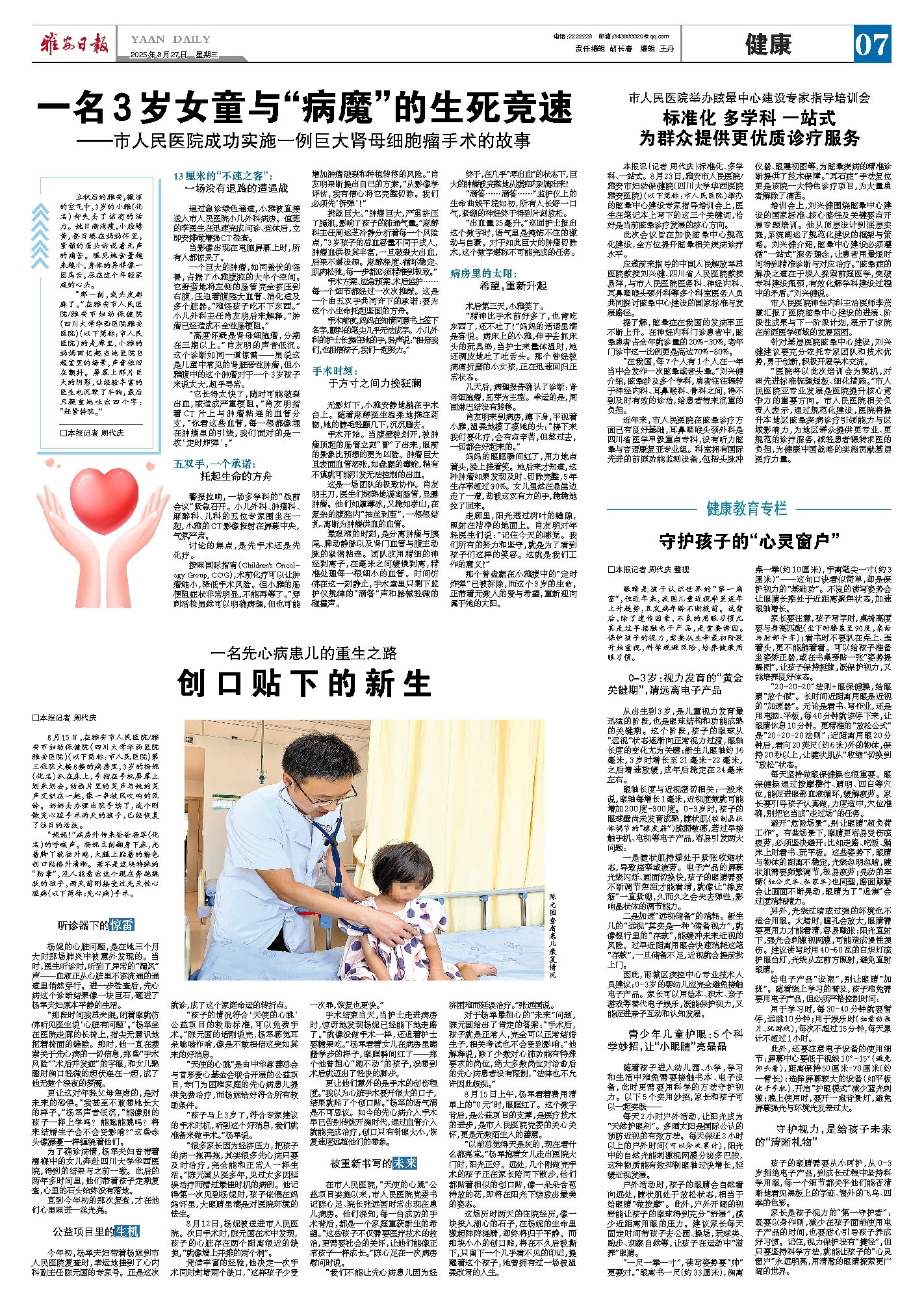8月15日,在雅安市人民医院/雅安市妇幼保健院(四川大学华西医院雅安医院)(以下简称:市人民医院)第三住院大楼8楼的病房里,3岁的杨妮(化名)趴在床上,手指在手机屏幕上划来划去,动画片里的笑声与她的笑声交织在一起,像一串被风吹响的风铃。奶奶去办理出院手续了,这个刚做完心脏手术两天的孩子,已经恢复了往日的活泼。